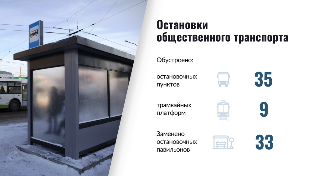 Предстоит ещё много сделать для повышения комфорта пассажиров. В 2023 году обустроено 35 остановочных пунктов для автобусов и троллейбусов, девять трамвайных платформ, заменено 33 павильона. Заключены пять инвестиционных договоров, по которым в собственность города поступит 11 остановочных навесов. Разработан проект размещения ещё 53 таких объектов.