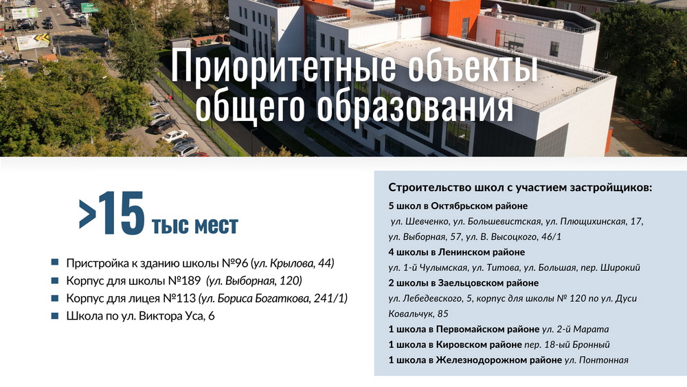 Перегруженность школ негативно сказалась на деятельности строительной отрасли. Прокуратура ограничила возможность выдачи разрешений на строительство. Поэтому департамент строительства совместно с министерством образования определили 17 объектов, создание которых считается первоочередным. Из них первые по списку школы на 2300 мест уже обеспечены финансированием. Это учреждение на улице Виктора Уса, дополнительный корпус лицея на Выборной и здание лицея на Бориса Богаткова.