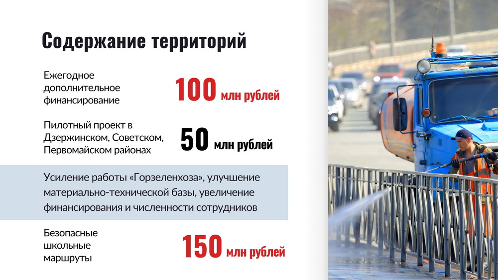 Кроме того, город приступает к реализации пилотного проекта по реконструкции и содержанию газонов, расположенных вдоль дорог на территории Дзержинского, Советского и Первомайского районов. На это предусмотрено дополнительное финансирование в размере 50 млн рублей.