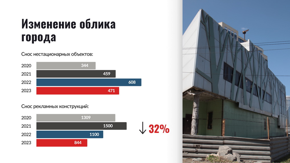 Олег Клемешов отметил ещё одно новое решение — разработан стандарт развития городских территорий «Наша улица». Он вводит ограничения в отношении избыточной рекламы, стандартизирует требования к наличию малых архитектурных форм. С улиц города в прошлом году убрали 471 самовольный нестационарный объект и 844 поверхности наружной рекламы. За два года количество крупноформатных рекламных носителей уменьшилось на 32%.