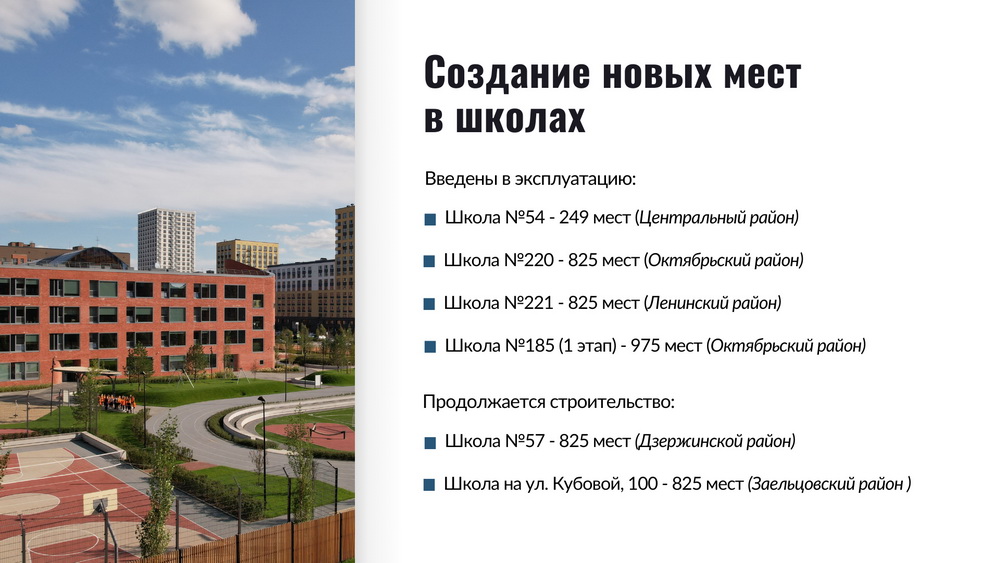 В 2023 году открыты школы в Центральном и Октябрьском районах, в кратчайшие сроки построена школа в Ленинском районе. В Октябрьском районе возводят здание лицея №185. В общей сложности это почти 3000 новых мест. Продолжается строительство школ в Дзержинском и Заельцовском районах.