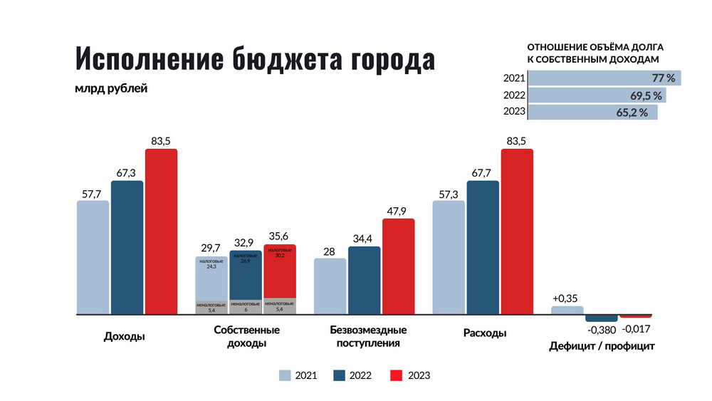С высокими результатами исполнен бюджет города. Доходы и расходы составили 83,5 млрд рублей, дефицит — 17 млн. Доходы выросли на 24%. Объём безвозмездных поступлений составил 48 млрд рублей, что в полтора раза больше, чем годом ранее.