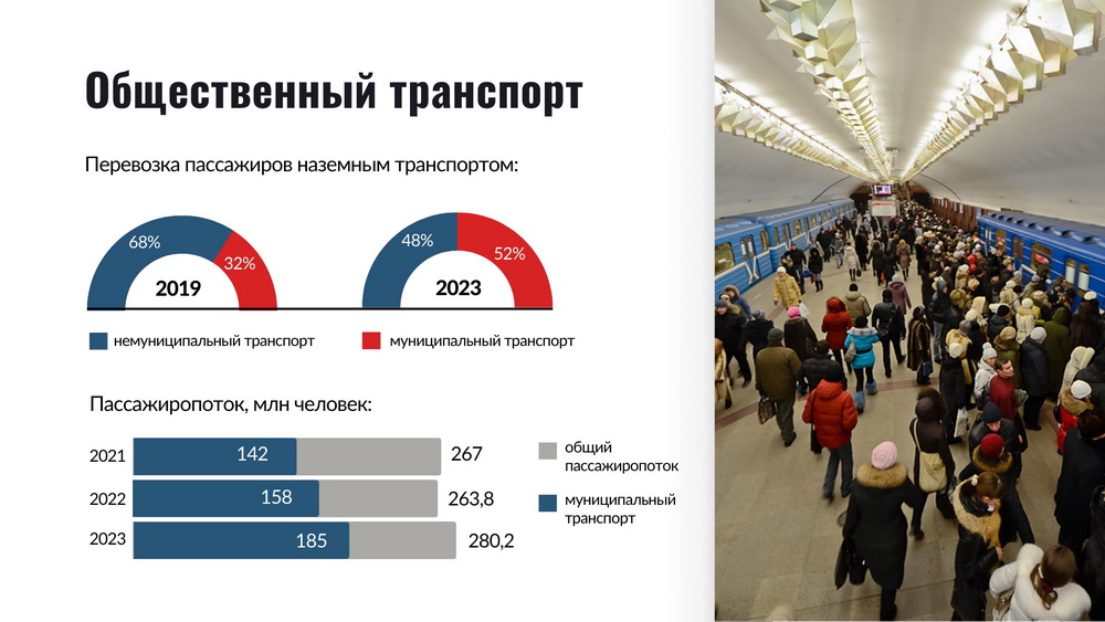 Действия по развитию городских перевозок принесли ощутимый результат. Увеличилось число пассажиров, которые пользуются муниципальным наземным транспортом. А его доля по отношению к коммерческим перевозкам с 2019 по 2023 год выросла с 32% до 52%.