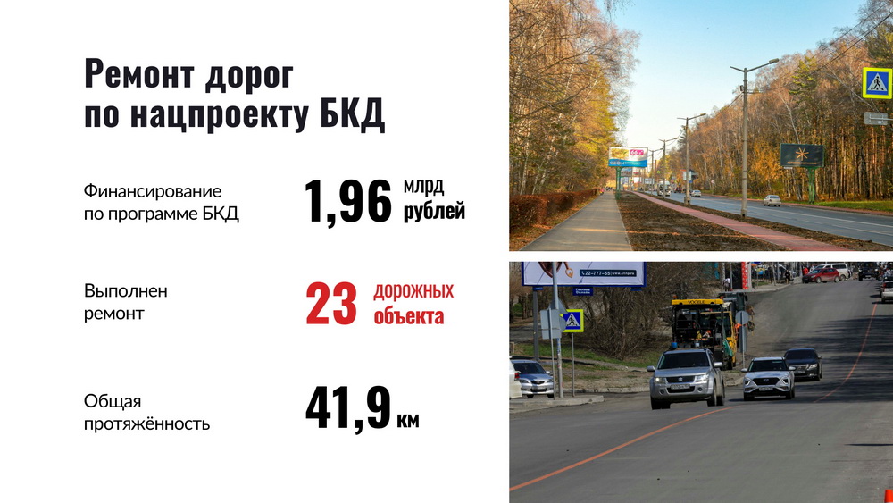 Среди знаковых объектов Олег Клемешов назвал ремонт Ипподромской магистрали (2021-2023 годы), дороги на дамбе ГЭС и улице Софийской, дорог на улице Иванова, Морском проспекте и проспекте Строителей в Академгородке, Советского шоссе и Винаповского моста в Кировском районе. В Ленинском районе это ремонт улицы Большой и единственного выезда из Затона — одной из самых изношенных дорог города с интенсивным движением. Улица Кропоткина обновлена практически полностью, капитальный ремонт выполнен на участке от Красного проспекта до Республиканской.
