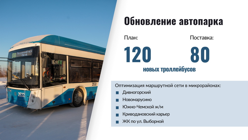 Фактически за 2023-2024 годы парк обновится на 258 троллейбусов. Улучшено транспортное обслуживание удалённых жилых массивов: Дивногорского, Новомарусино, района педуниверситета и ряда других. В 2024 году планируется запустить новые машины до микрорайонов «Стрижи», «Родники», «Радуга Сибири», «Европейский берег», в район улиц Полякова и Амбулаторной, на МЖК «Восточный» и к автовокзалу.