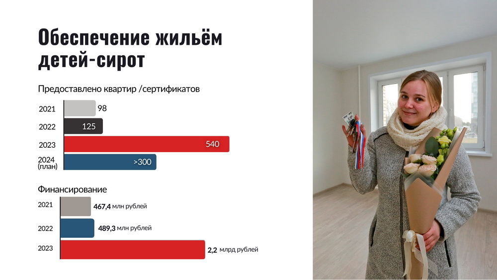За четыре года работы по изменённой системе благоустроенным жильём обеспечены почти 1000 детей-сирот. Хорошую динамику показали в 2023 году. На эти цели направлено более 2 млрд рублей.