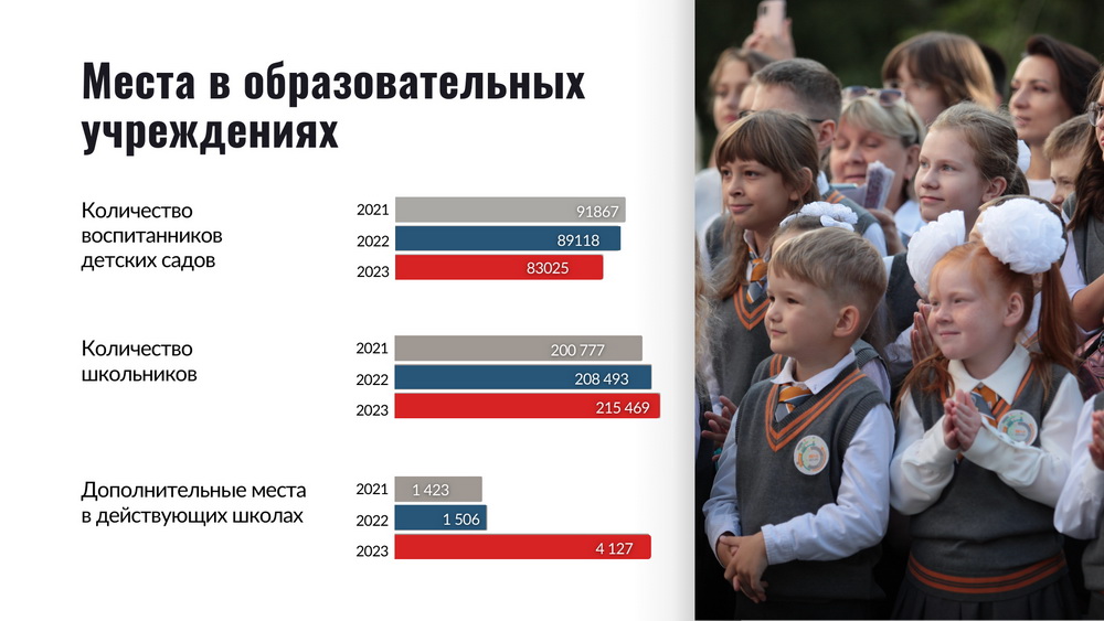 Демографическая ситуация развивается волнообразно, это меняет уровни загрузки детсадов и школ. Сейчас количество дошколят стабильно снижается. При этом растёт число школьников. За счёт оптимизации помещений создаются дополнительные школьные места. За 2023 год их число превысило 4000.