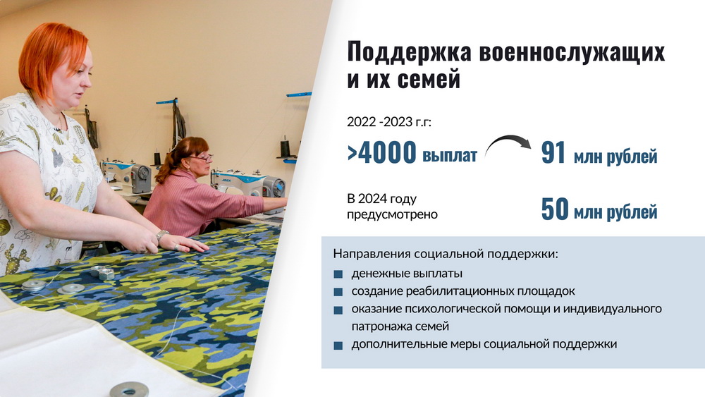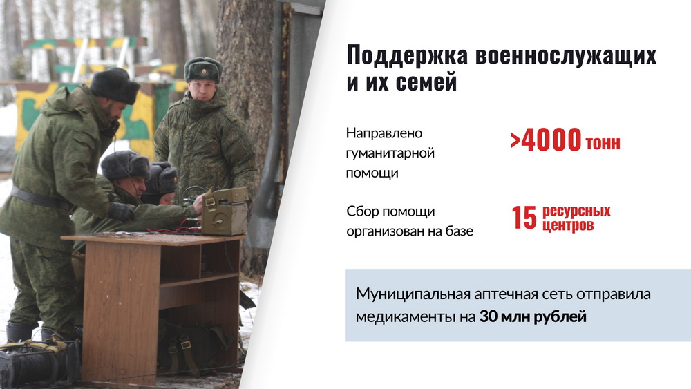 Приоритет в социальной отрасли — поддержка военнослужащих и их родных, расходы, связанные с достижением победы в СВО. С самого начала город включился в работу с семьями: в каждом районе проводили встречи, индивидуальные консультации. Важно было поддержать людей, не оставлять их один на один с проблемами, дать понять, что о них позаботятся.
