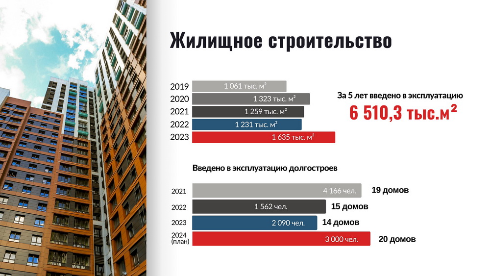 Высокими темпами развивается строительство. В 2023 году в эксплуатацию ввели 1,6 млн кв. метров. Установленный контрольный показатель выполнен на 126%. Решён вопрос по 14 проблемным объектам. По оставшимся 20 определены механизмы окончания стройки.