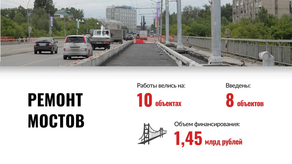 Впервые провели настолько масштабный ремонт мостовых сооружений и путепроводов: десять объектов, из них восемь ввели в эксплуатацию. В этом году предстоит завершить работы ещё по двум: это Октябрьский мост и правый путепровод на улице Фрунзе. Приступят к обновлению четырёх объектов, включая Димитровский мост.