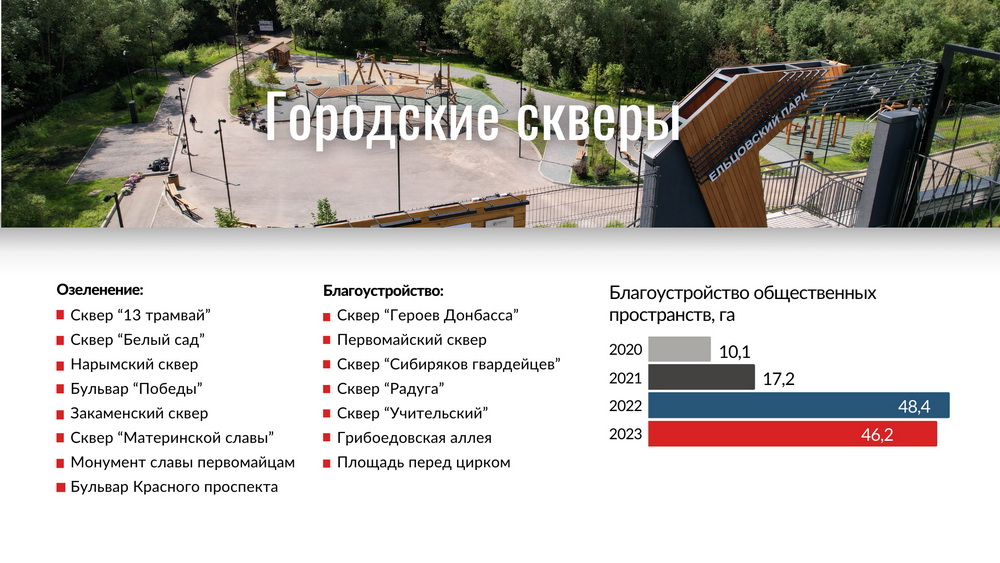 Он подчеркнул, что усилия по привлечению бизнеса к созданию зелёных зон дают результаты. Обновлён сквер «Крылья Сибири» на средства авиакомпании. Сделана первая очередь Ельцовского парка силами застройщика «Химметалл».