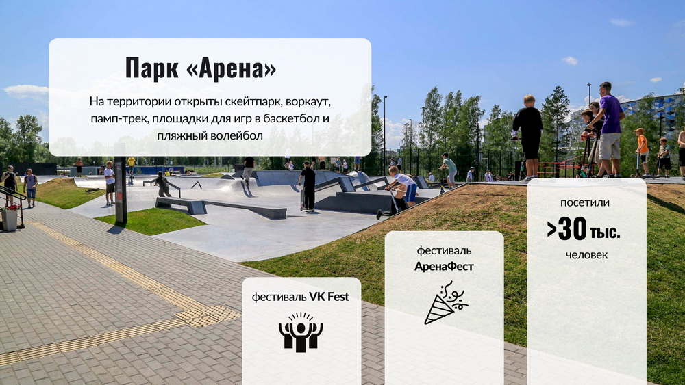 Нарастают объёмы создания зелёных зон. В парке «Арена» дополнительно привели в порядок береговую линию, сделали баскетбольные площадки. Новая территория позволила на достойном уровне провести 130-летие Новосибирска и новогодние мероприятия.
