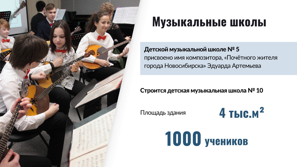 Другие важные результаты — окончание ремонта музыкальной школы №5 и начало строительства здания музыкальной школы в Академгородке. Для детской киностудии «Поиск» будет отремонтировано здание на Детском проезде, 17. Учреждение, отметившее 50-летний юбилей, сможет полноценно развернуть творческую работу.