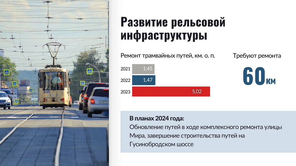 Отдельного внимания требует развитие рельсовой инфраструктуры. В прошедшем году за счёт бюджета города выполнен ремонт пяти километров линий. В 2024 году обновят трамвайные пути в ходе комплексного ремонта улицы Мира и продолжат строительство ветки на Гусинобродском шоссе. В целом потребность в капитальном ремонте составляет 60 километров одиночного пути.