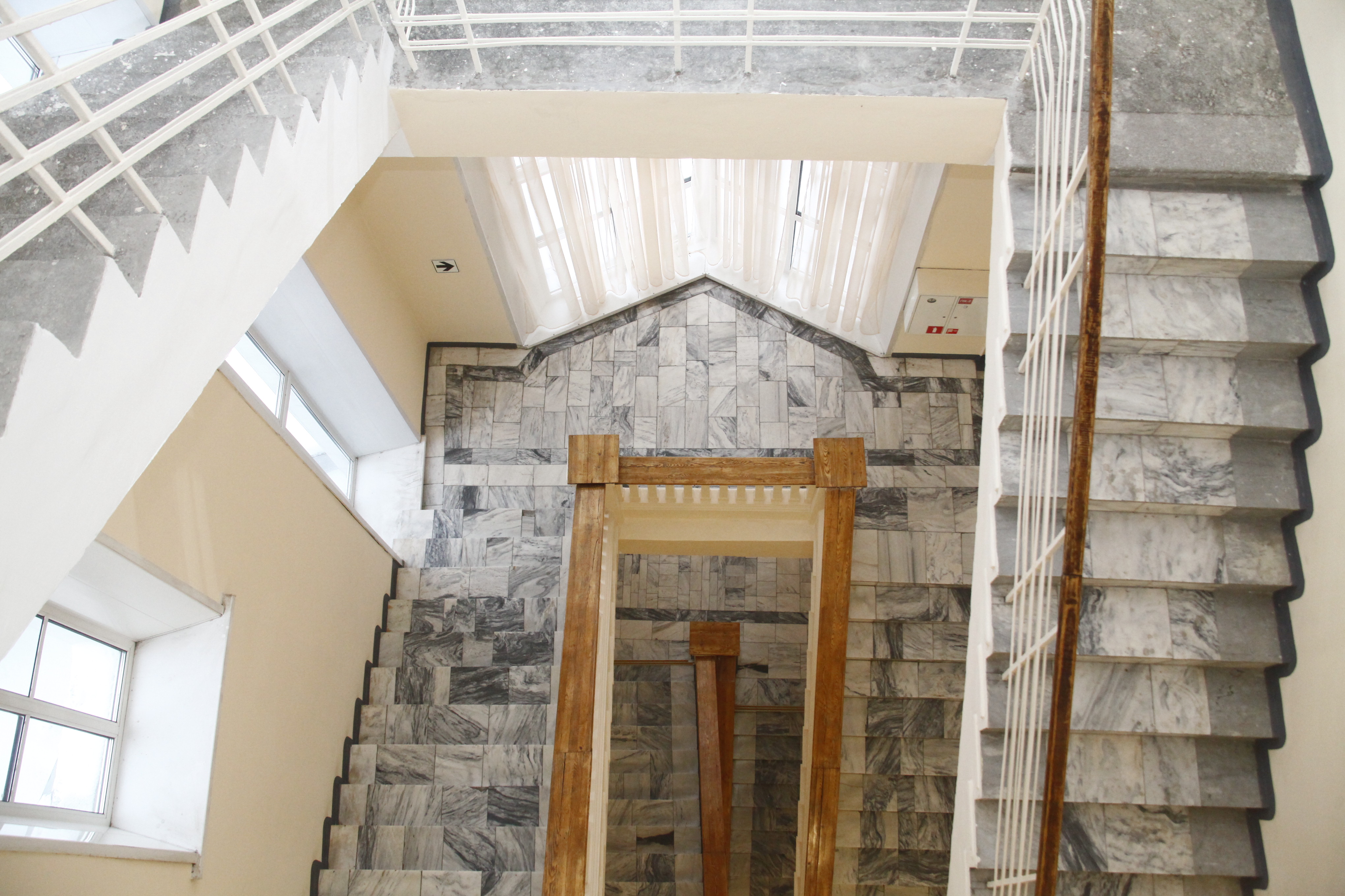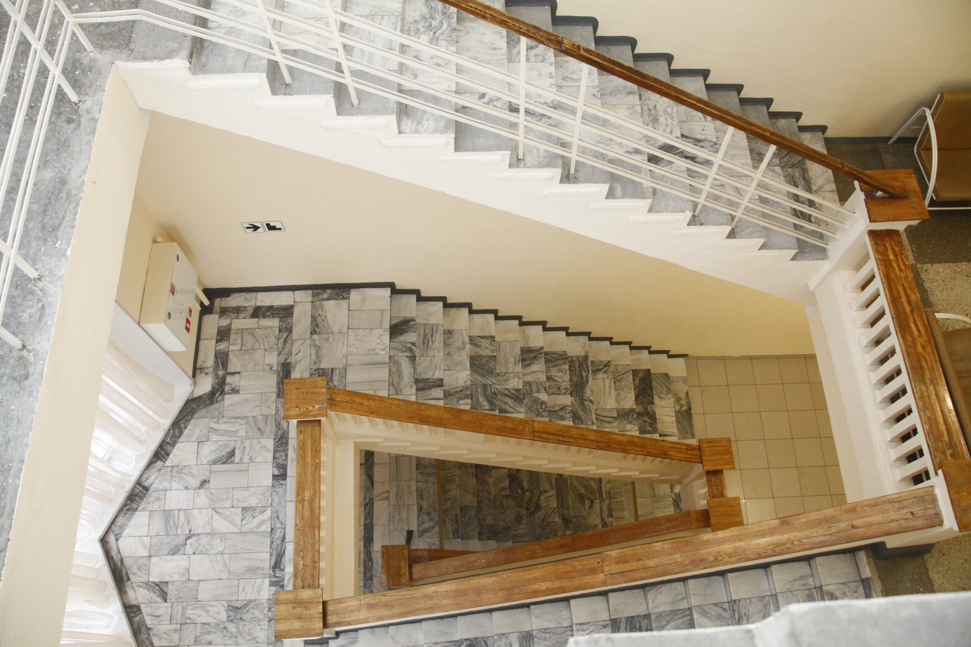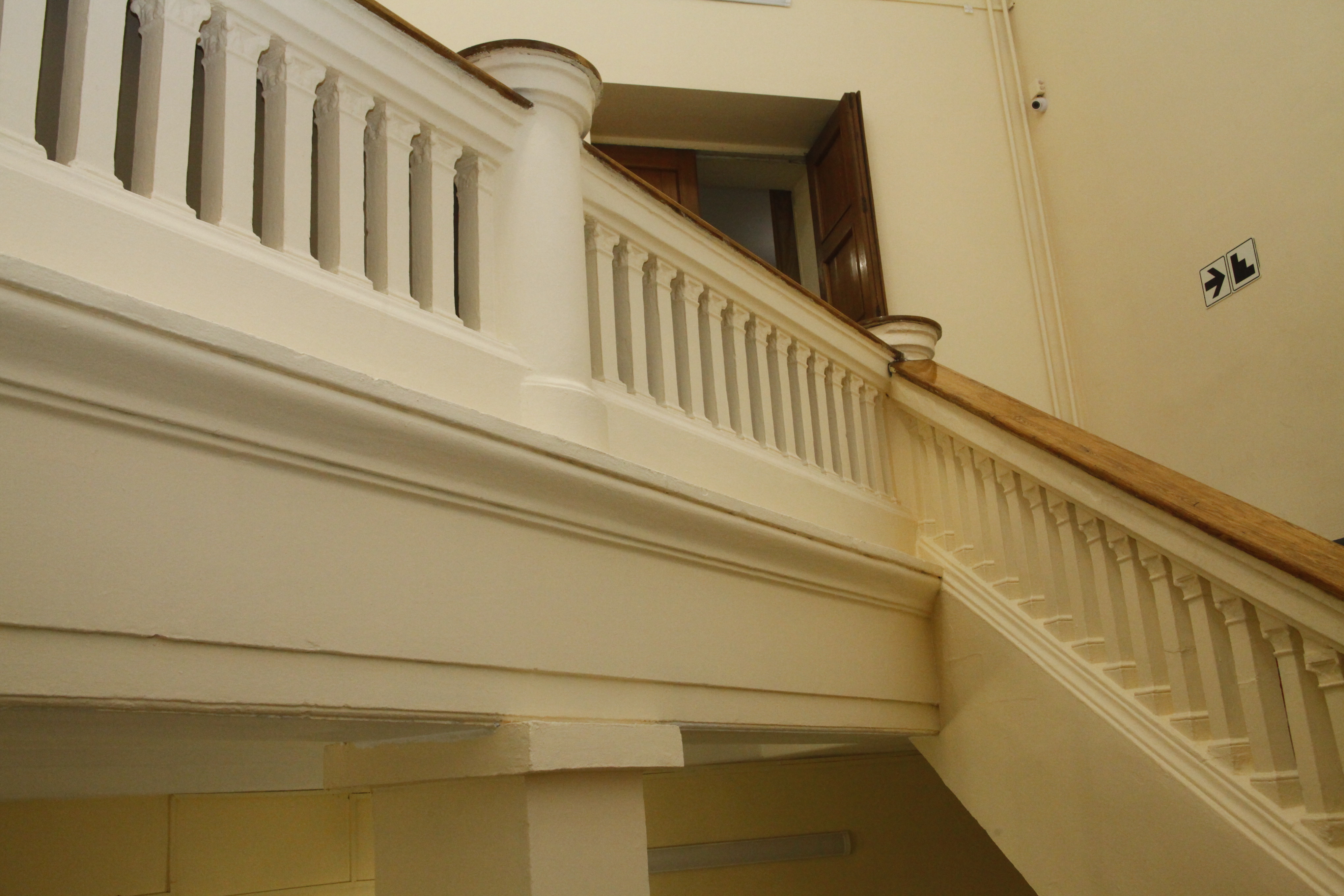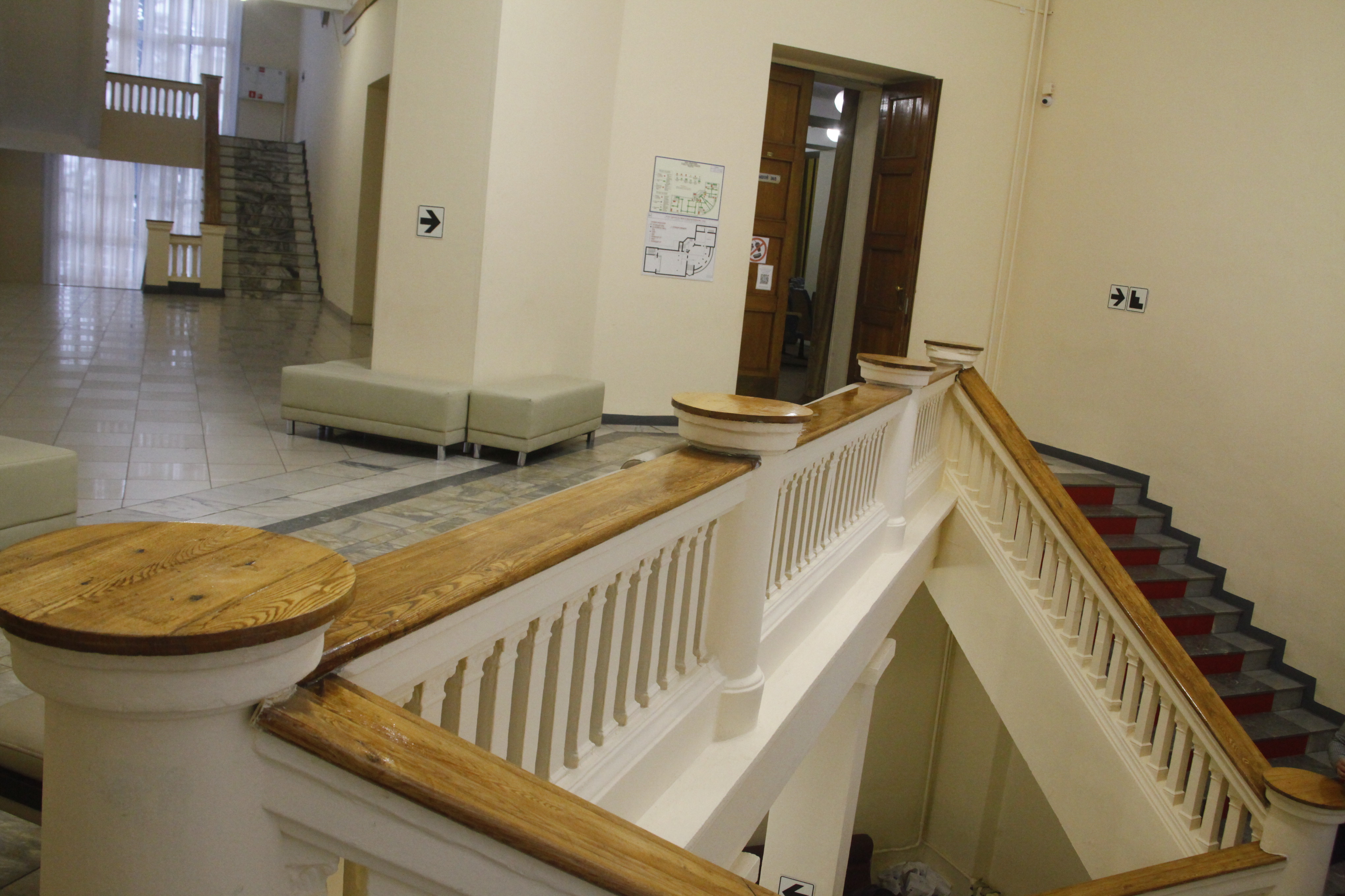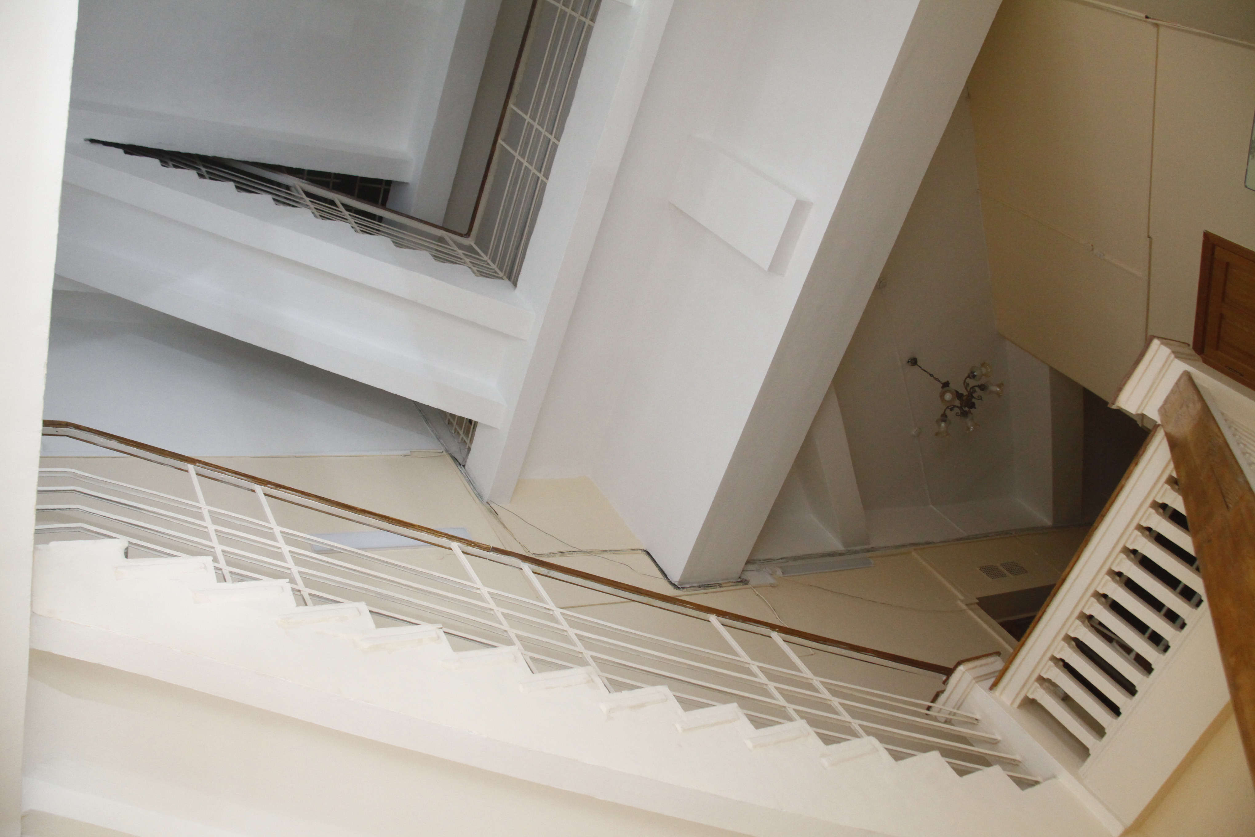 Если присмотреться к лестнице, ведущей с первого этажа на самый верх, то можно заметить, что пролёты кверху сужаются. Это одна из главных черт рационализма — чем выше, тем трафик меньше.