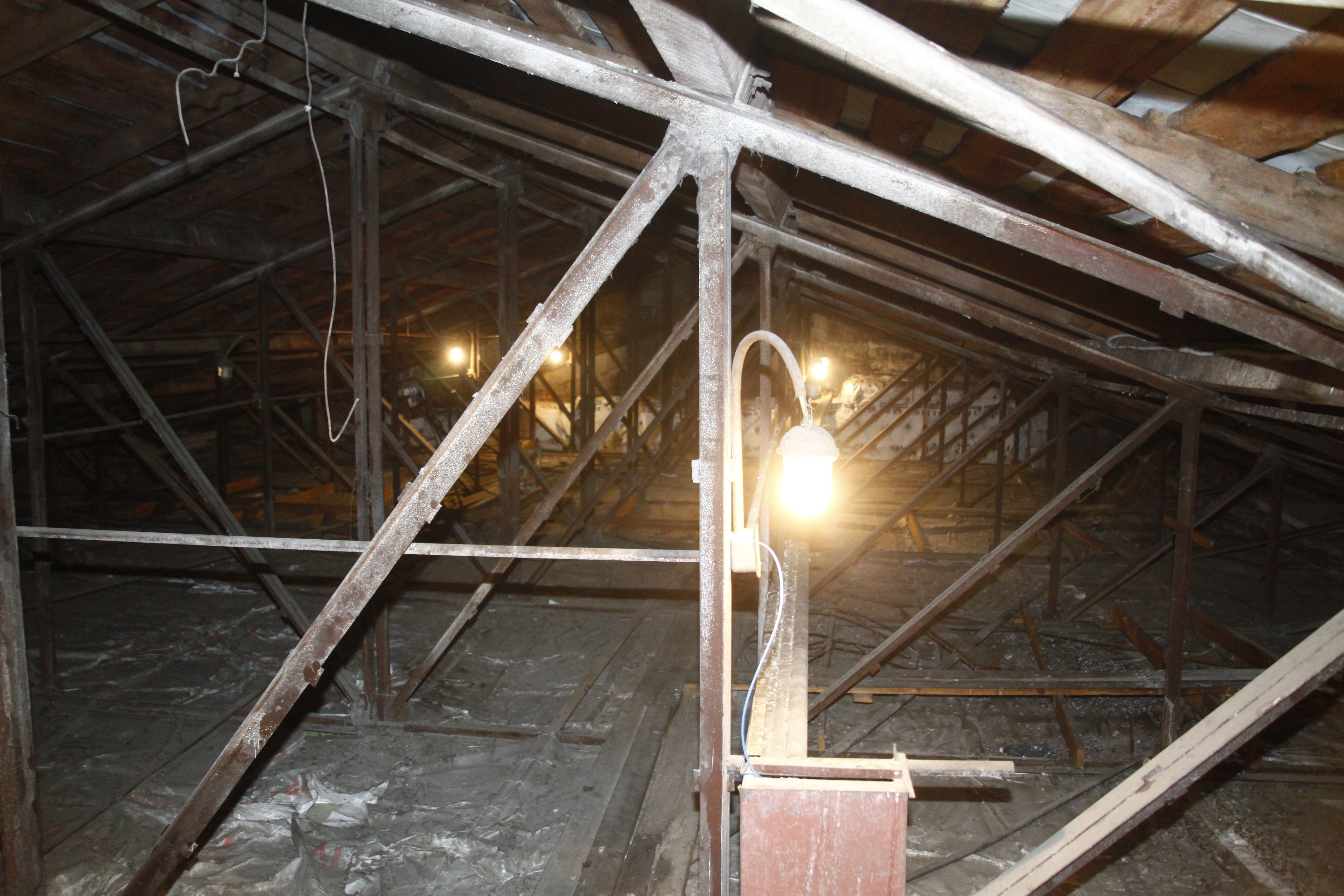Стропильная система сохранилась в рабочем состоянии с момента постройки. Попав под крышу, можно потрогать 100-летнее дерево.