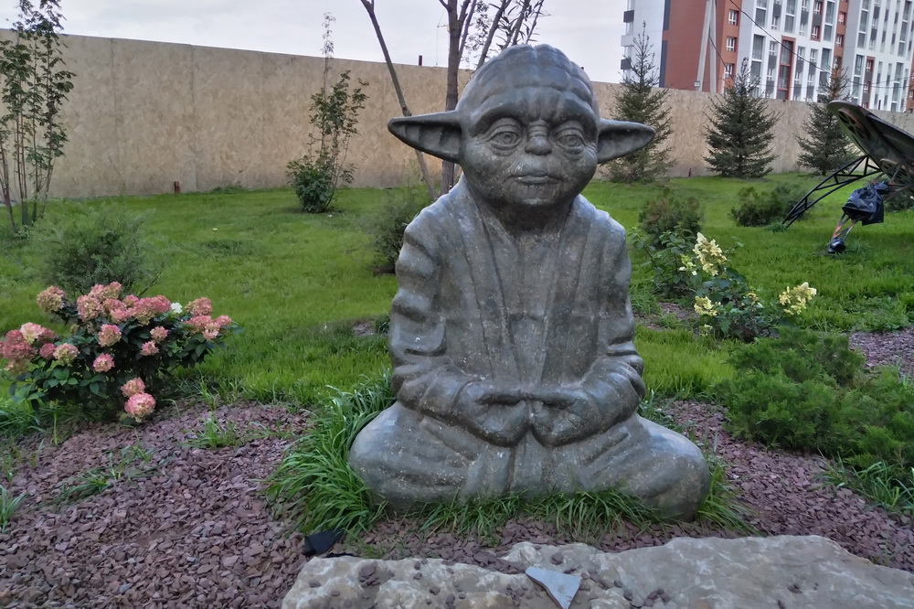 Во дворе одного из новых жилых комплексов Новосибирска обустроили космический парк. Главным его обитателем стал легендарный джедай киносаги «Звёздные войны» Магистр Йода, отлитый из искусственного камня. Герой в медитативной позе сидит возле упавшей летающей тарелки.