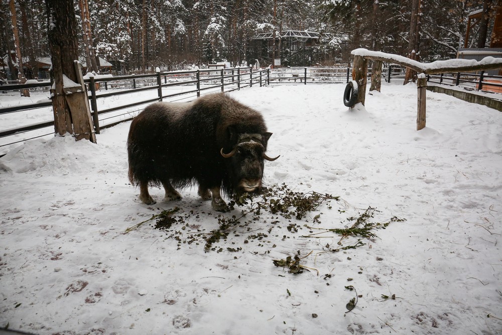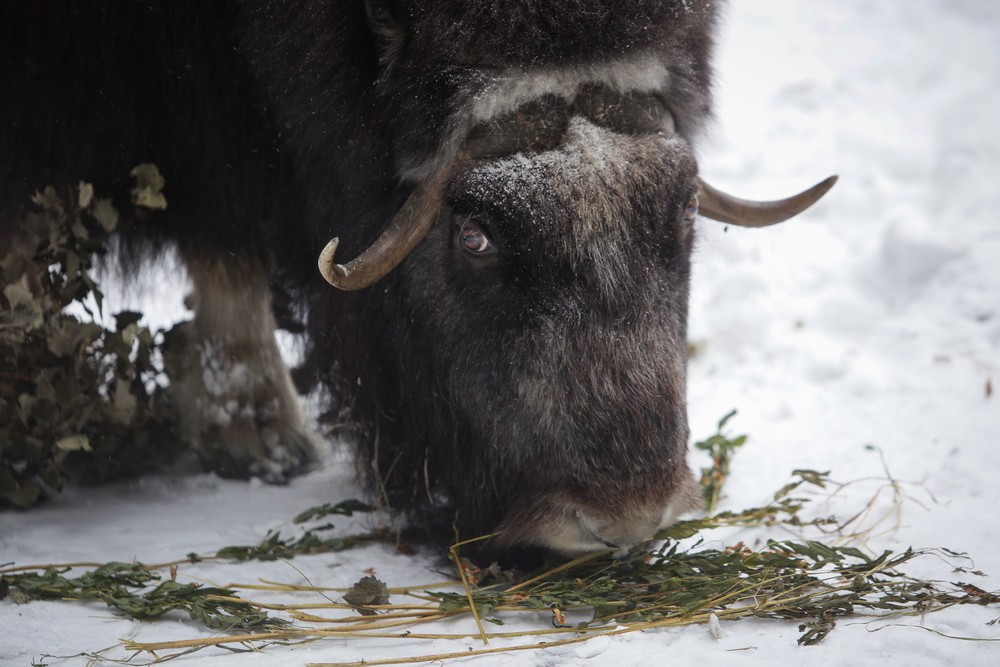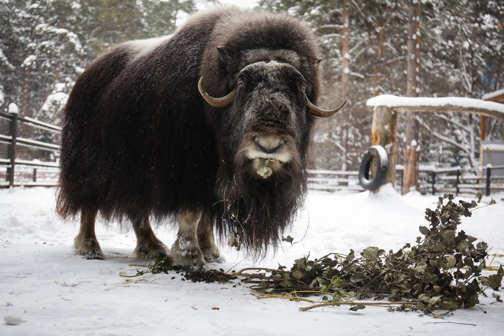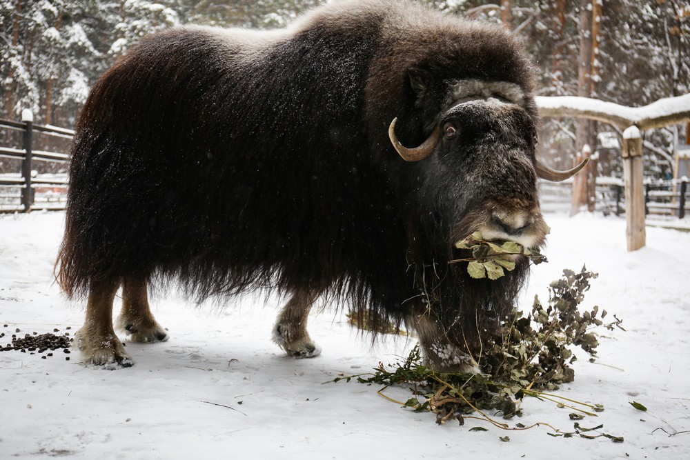 «Тундра очень любит веники из осины и луговой травы чины. Уминает их с большим удовольствием — съедает всё до последнего листочка. Мы вяжем веники для Тундры и других травоядных всем зоопарком. Сами ездим в поля и леса, собираем растения. Но в основном Тундра у нас, конечно, питается сеном. Она постоянно что-то жуёт», — рассказывает зоотехник Евгений Данильченко, который последние пять лет ухаживает за овцебыком.