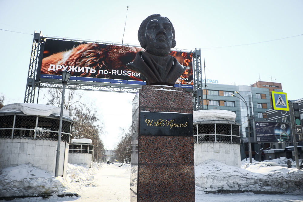 Этот объект находится в начале бульвара на пересечении Красного проспекта и улицы Крылова. Открыли бюст баснописца 8 октября 2010 года. Создал памятник скульптор Александр Бортник.