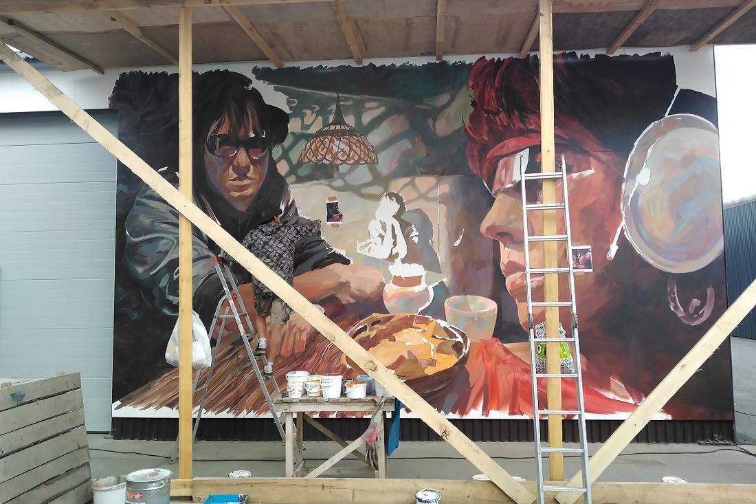 «Я смотрел “Иглу”, останавливал, делал скрин и смотрел дальше. Затем выбрал кадры и перенёс на стену», — рассказал Василий Каптырев. Художник работает по загрунтованной фанере колерованным лаком для наружных работ. В итоге должно получиться надёжное покрытие, которому не страшны ни дождь, ни снег.