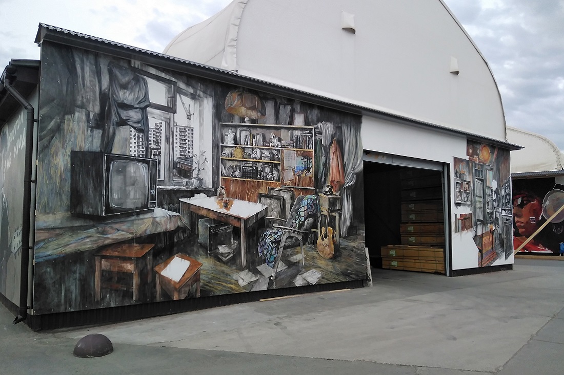 Живописные и графические муралы создаёт известный российский стрит-арт художник Василий Каптырев. В прошлом году он расписал масляными красками и углём большую стену ангара.