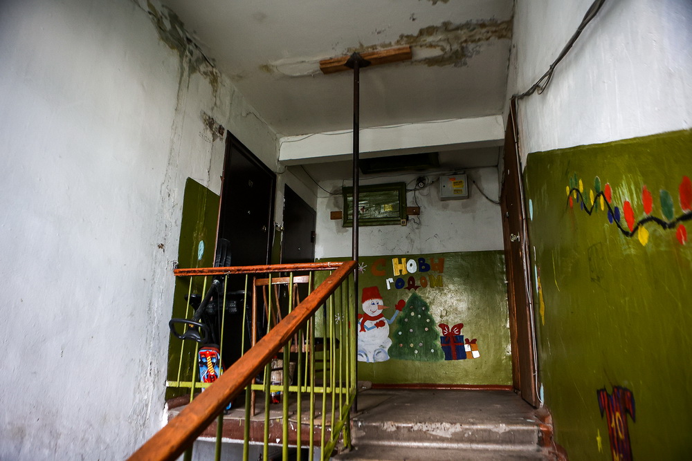 По словам старшей по дому, на пятом этаже в её подъезде вот уже больше 50 лет потолок на лестничной клетке держит стальная опора.