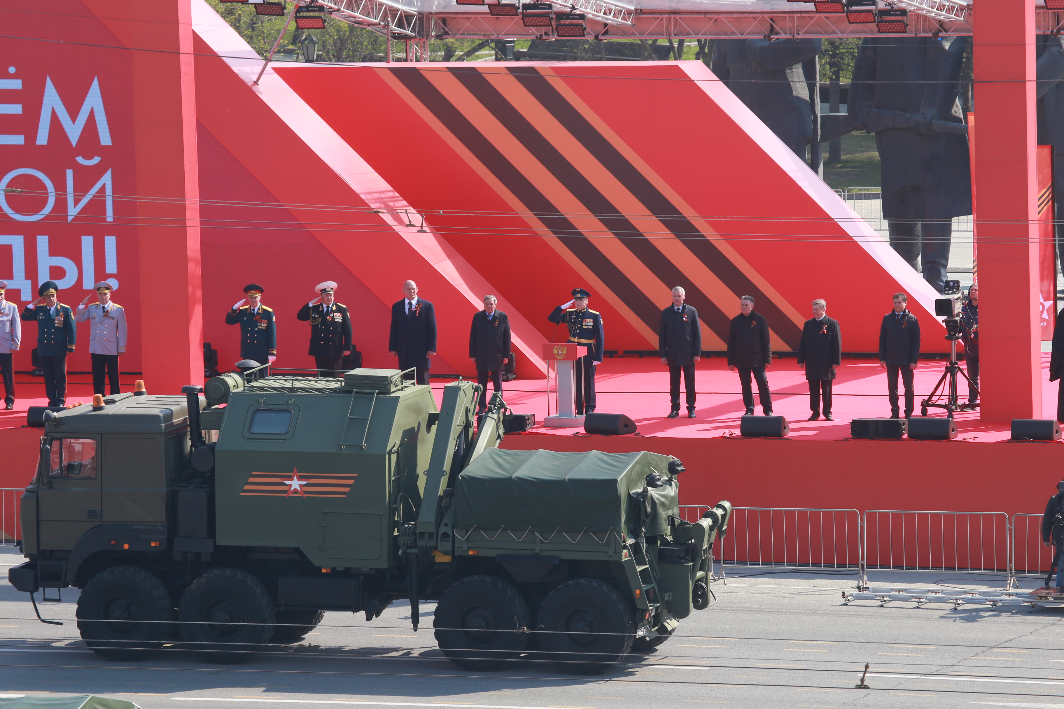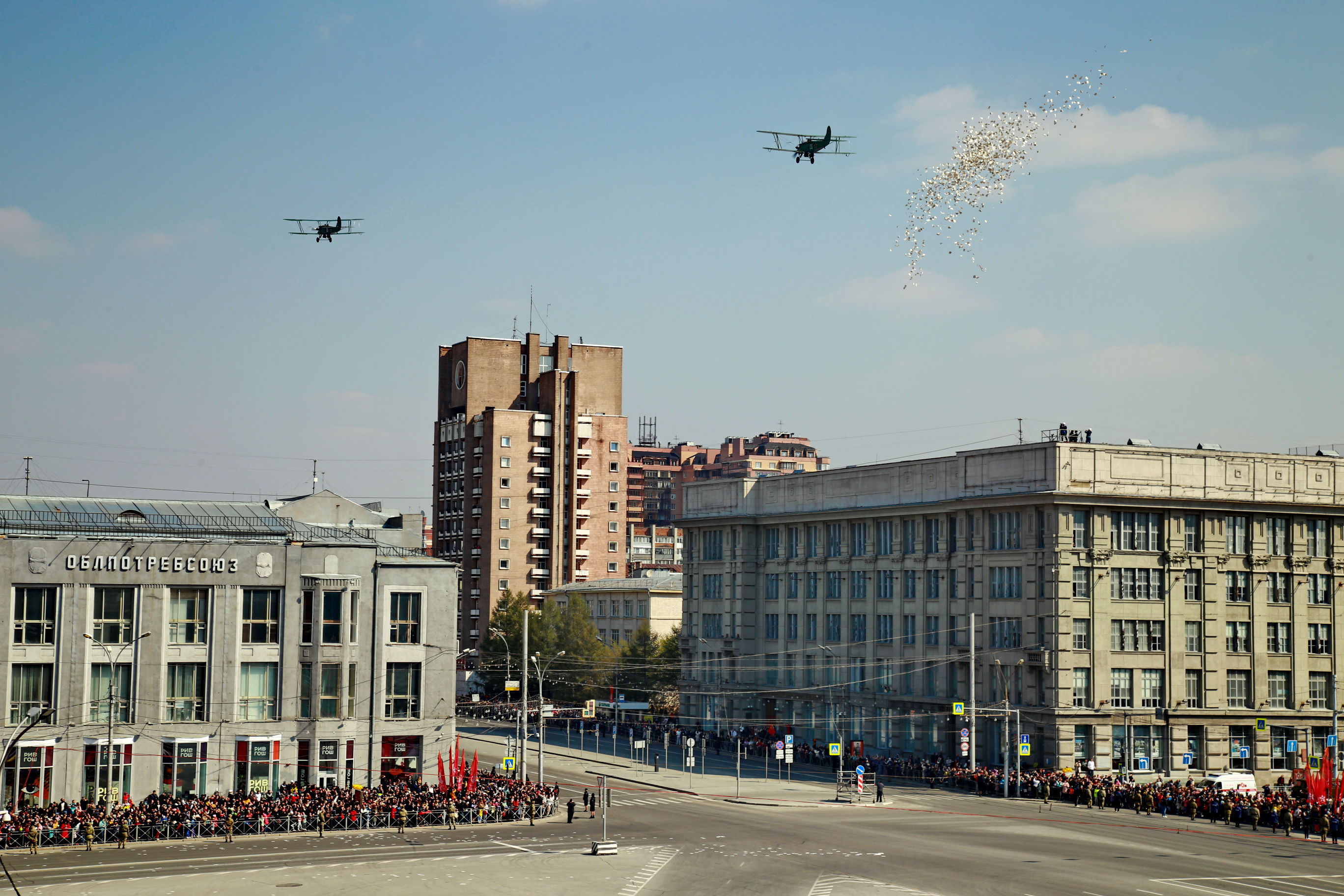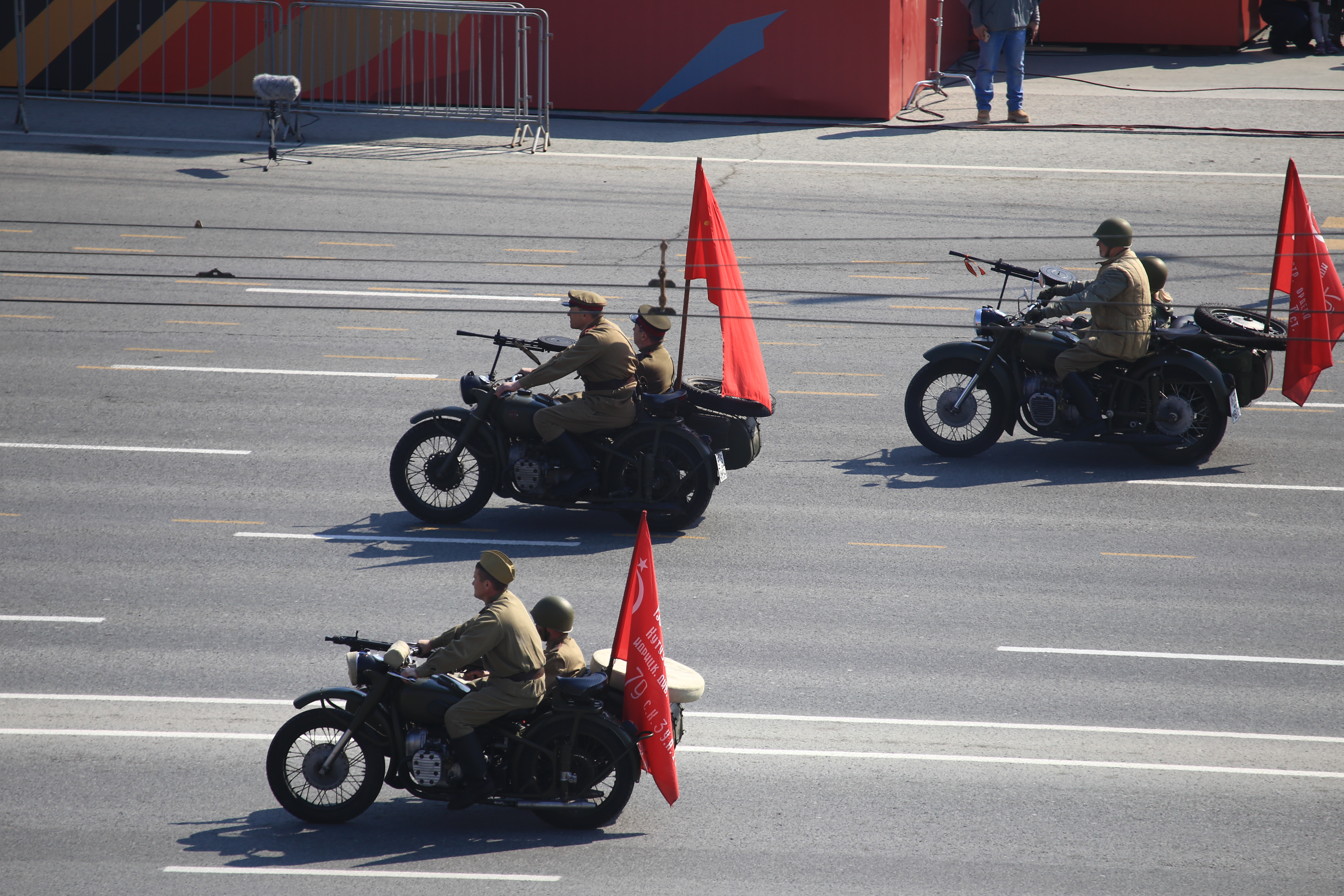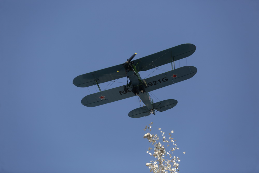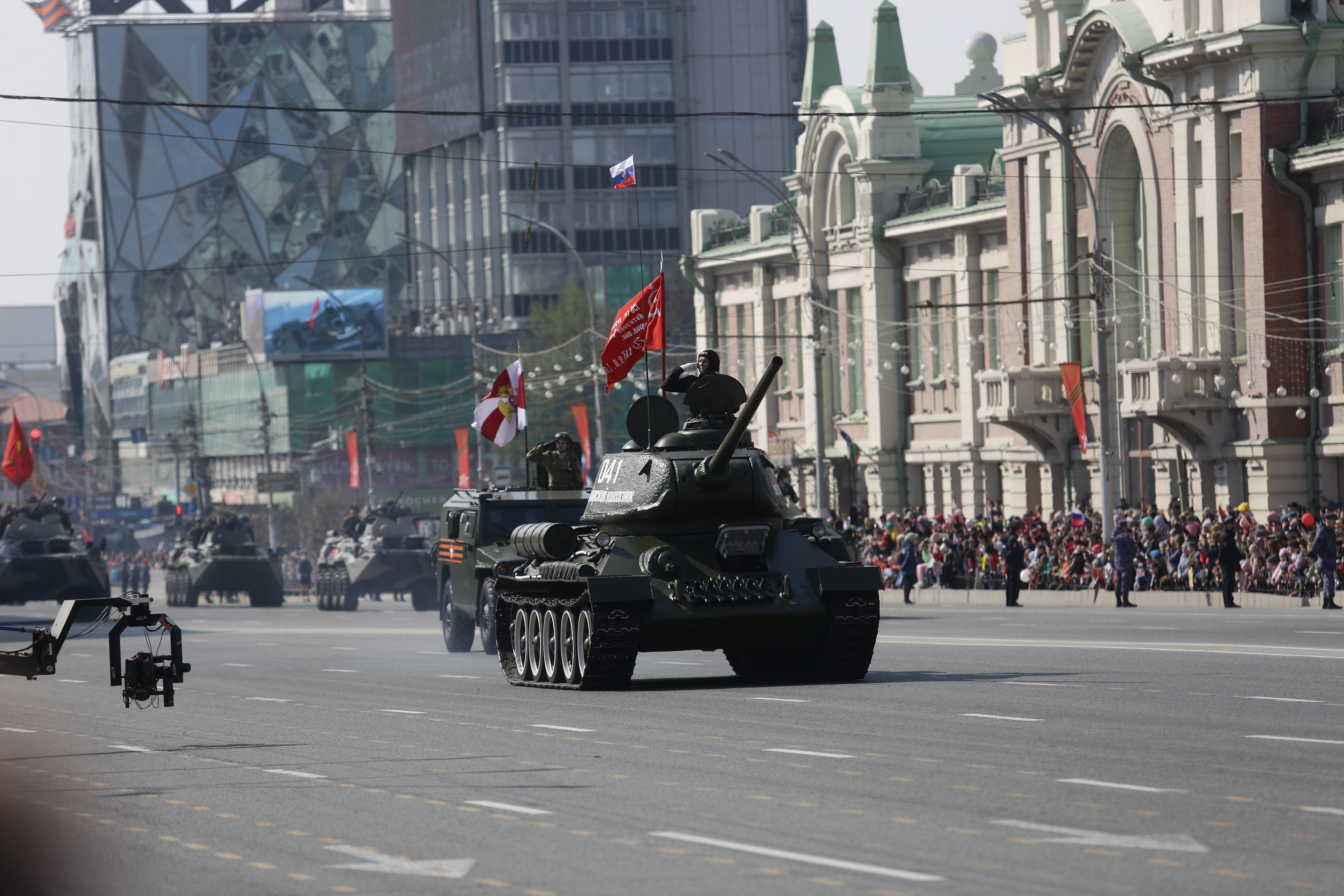 Следом по площади поехала военная техника — вначале отреставрированный танк Т-34, затем бронеавтомобили «Тигр», бронетранспортёры, зенитные комплексы С-400, «Ярс», «Град» и, конечно, легендарная «Катюша». В небе пролетел современный истребитель, а также бипланы, с одного из которых над площадью разбросали листовки.