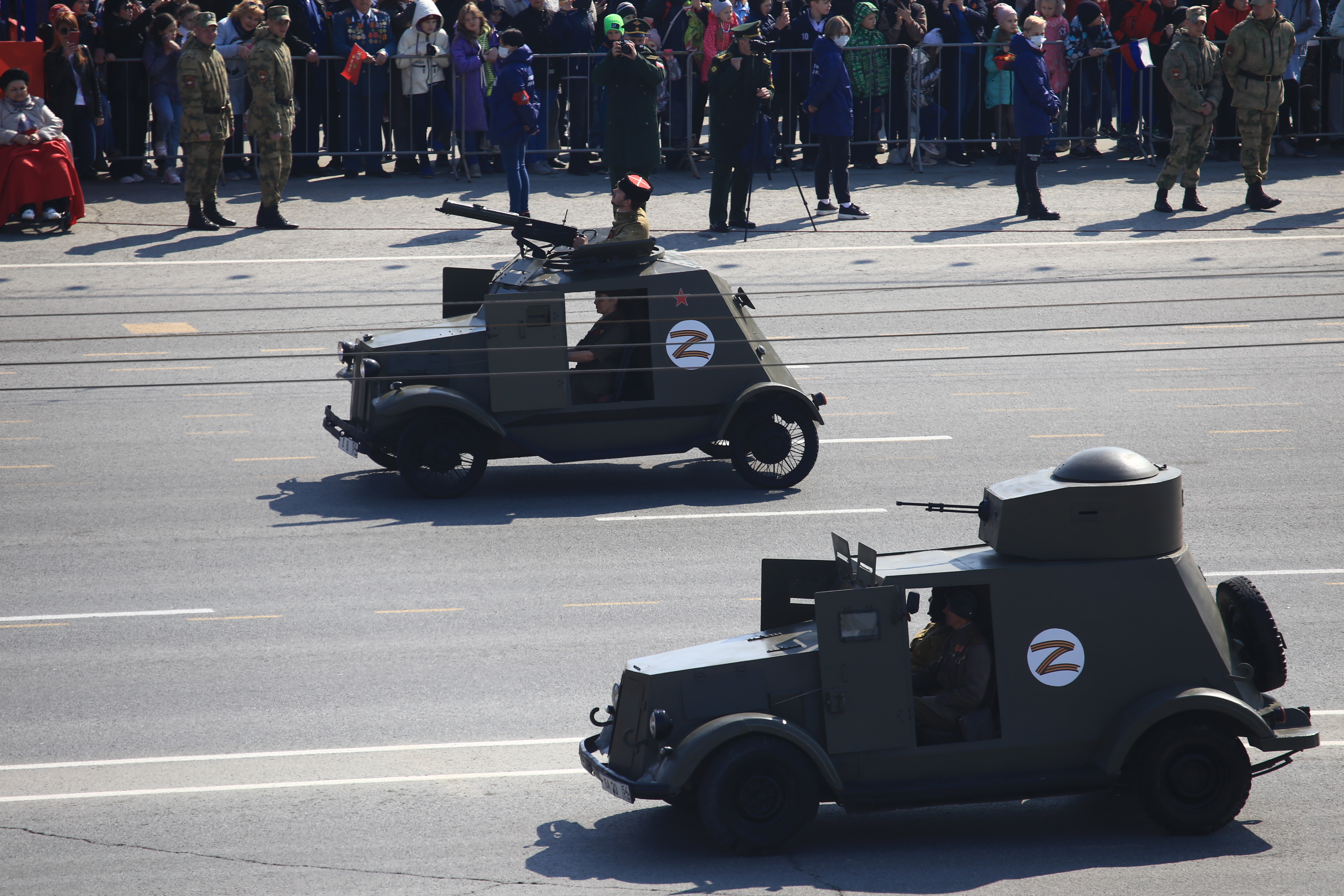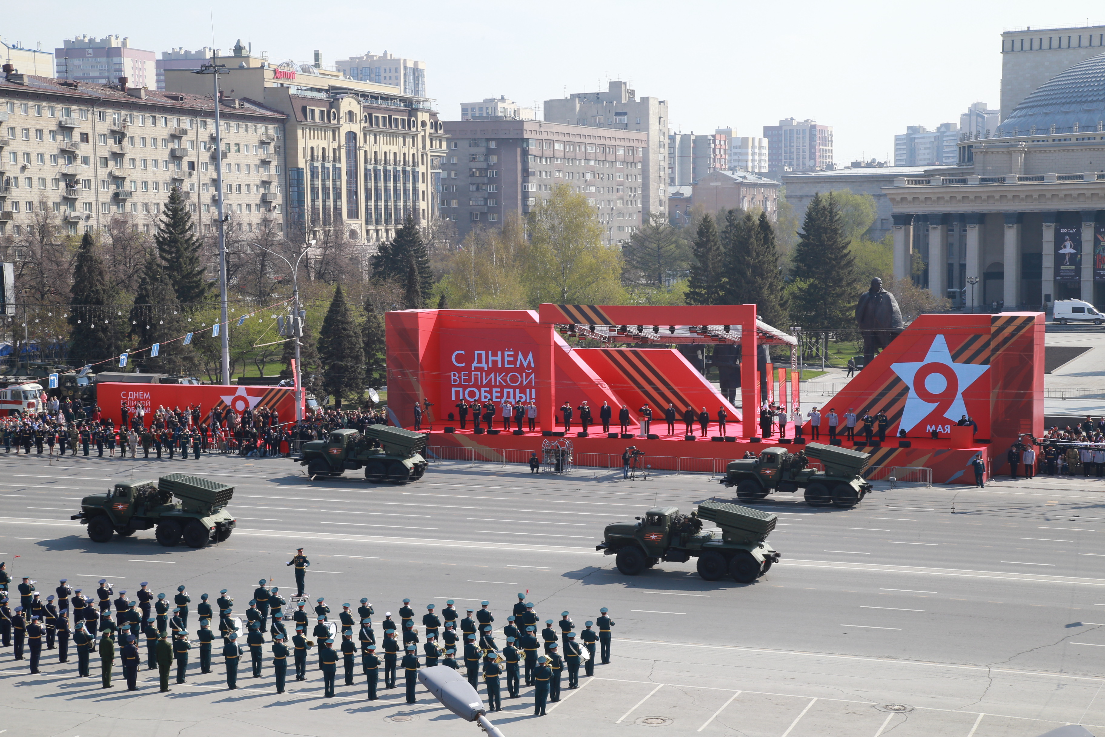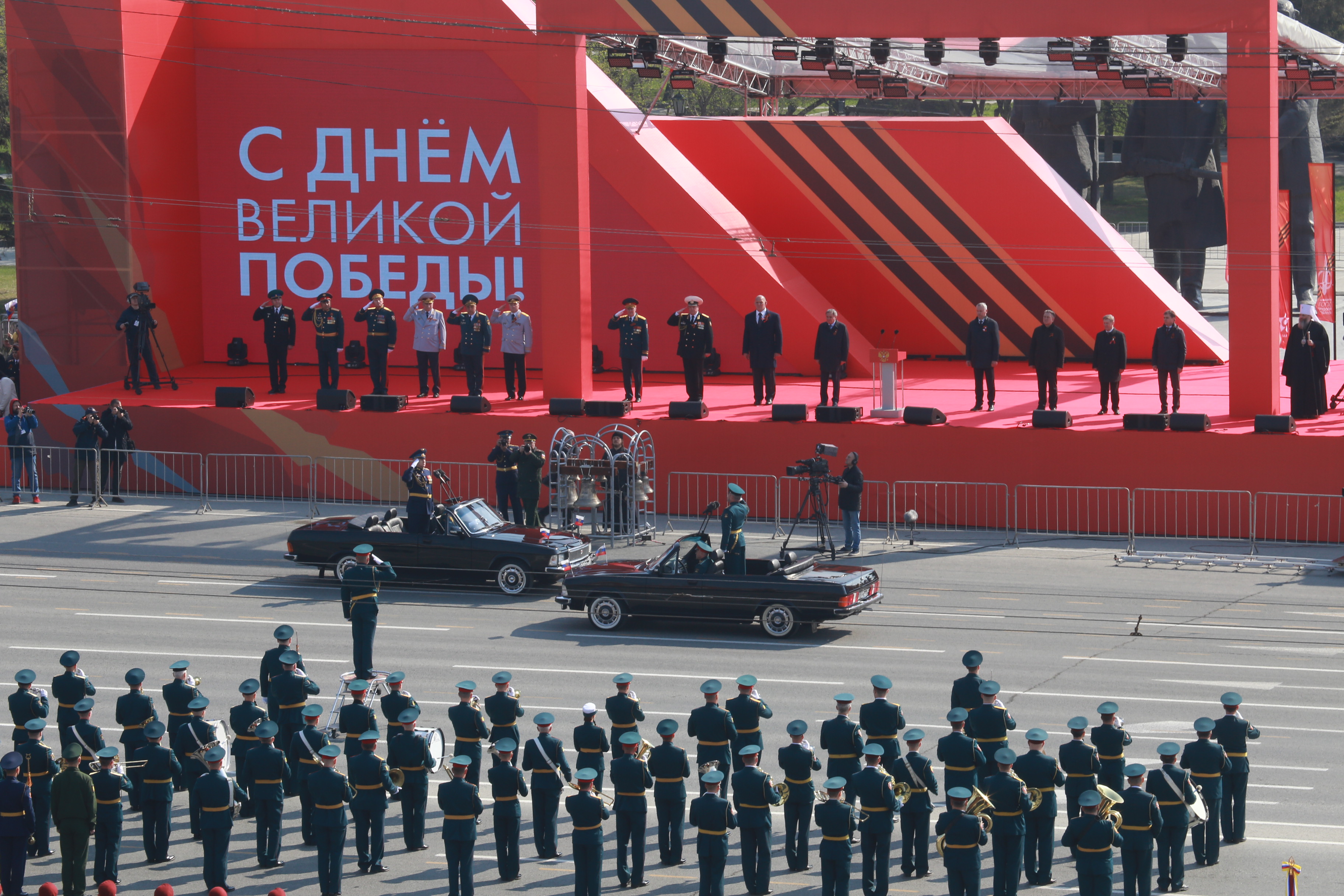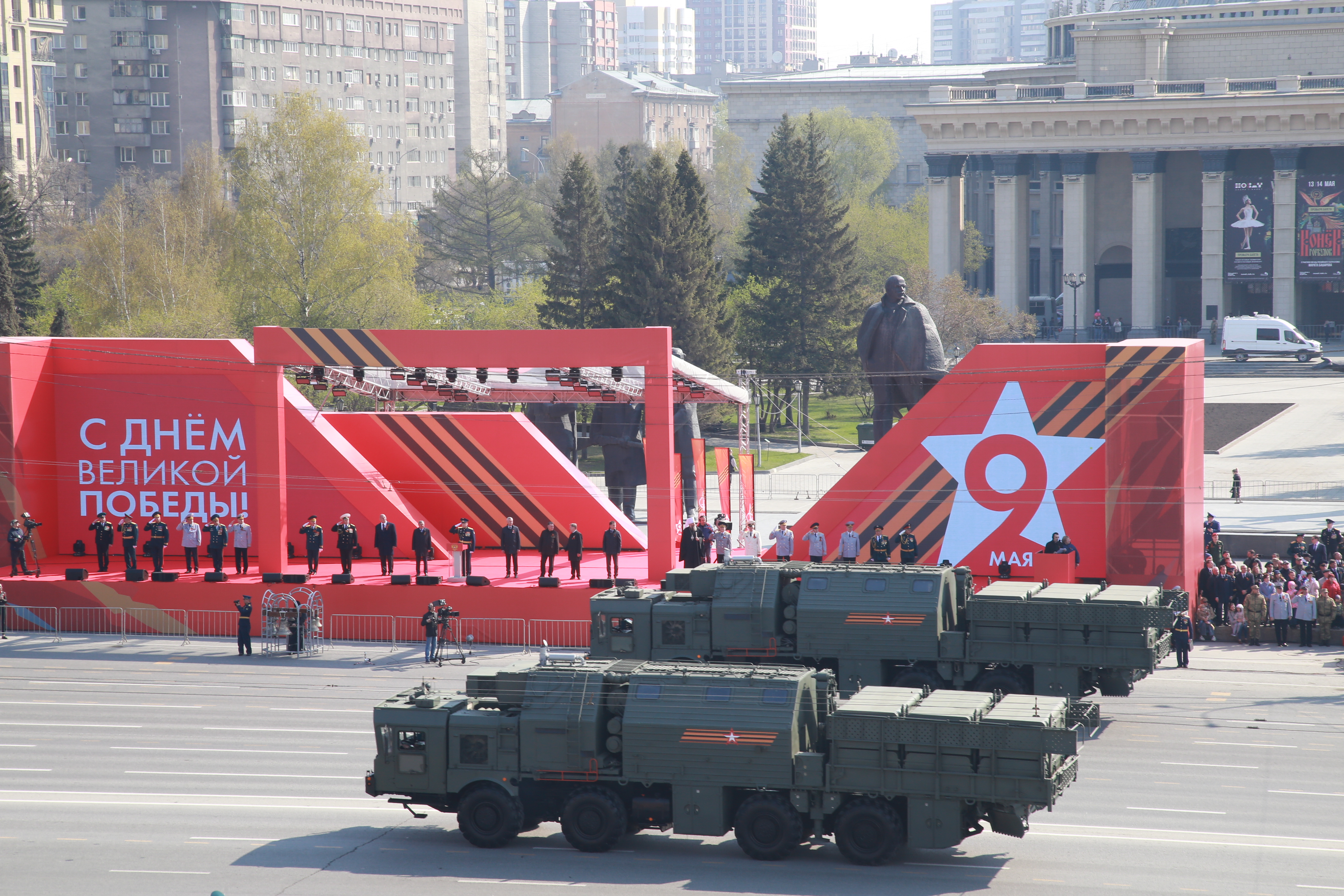 Следом по площади поехала военная техника — вначале отреставрированный танк Т-34, затем бронеавтомобили «Тигр», бронетранспортёры, зенитные комплексы С-400, «Ярс», «Град» и, конечно, легендарная «Катюша». В небе пролетел современный истребитель, а также бипланы, с одного из которых над площадью разбросали листовки.