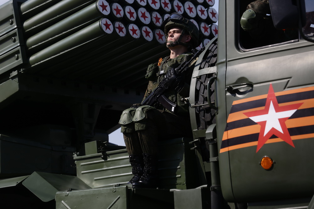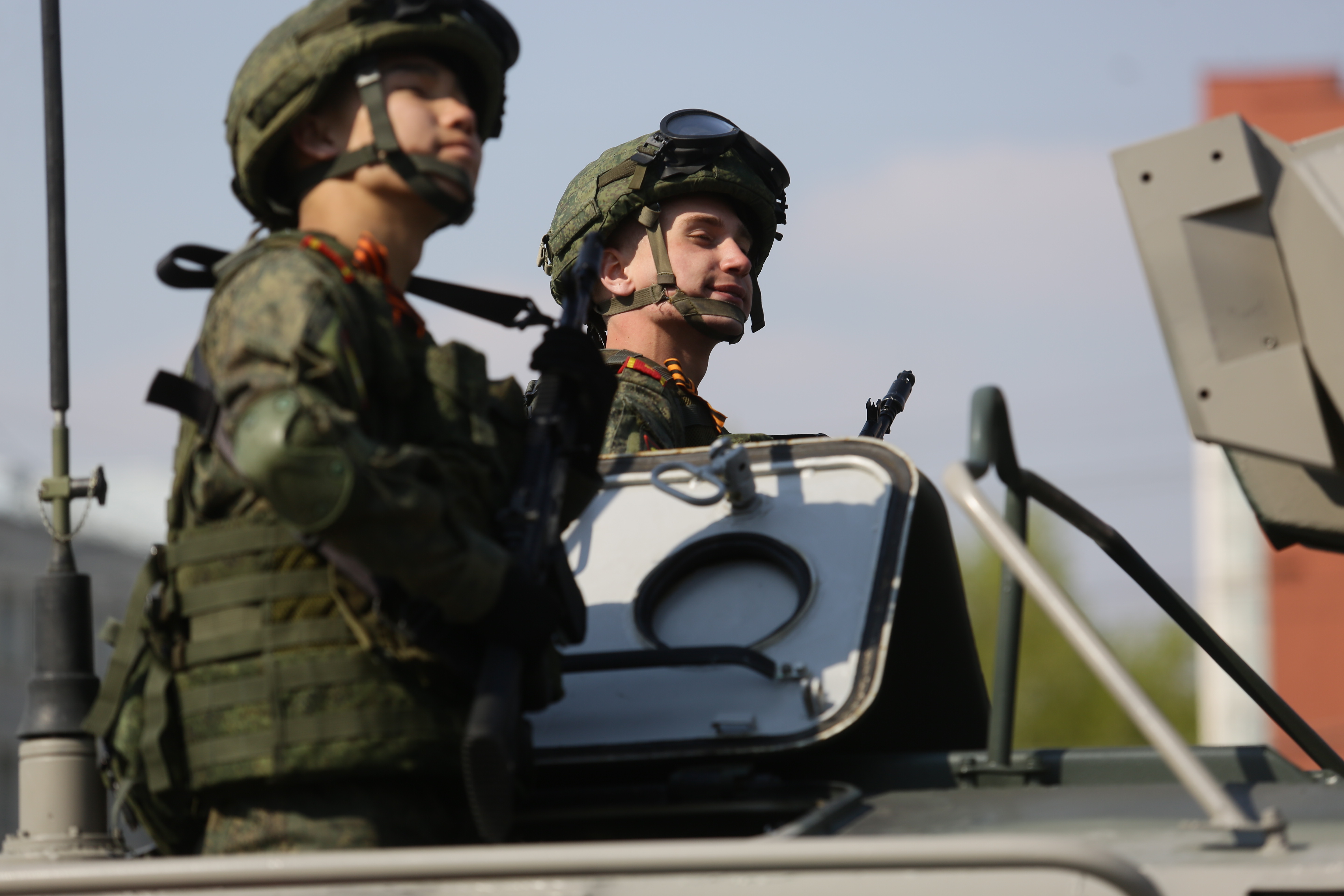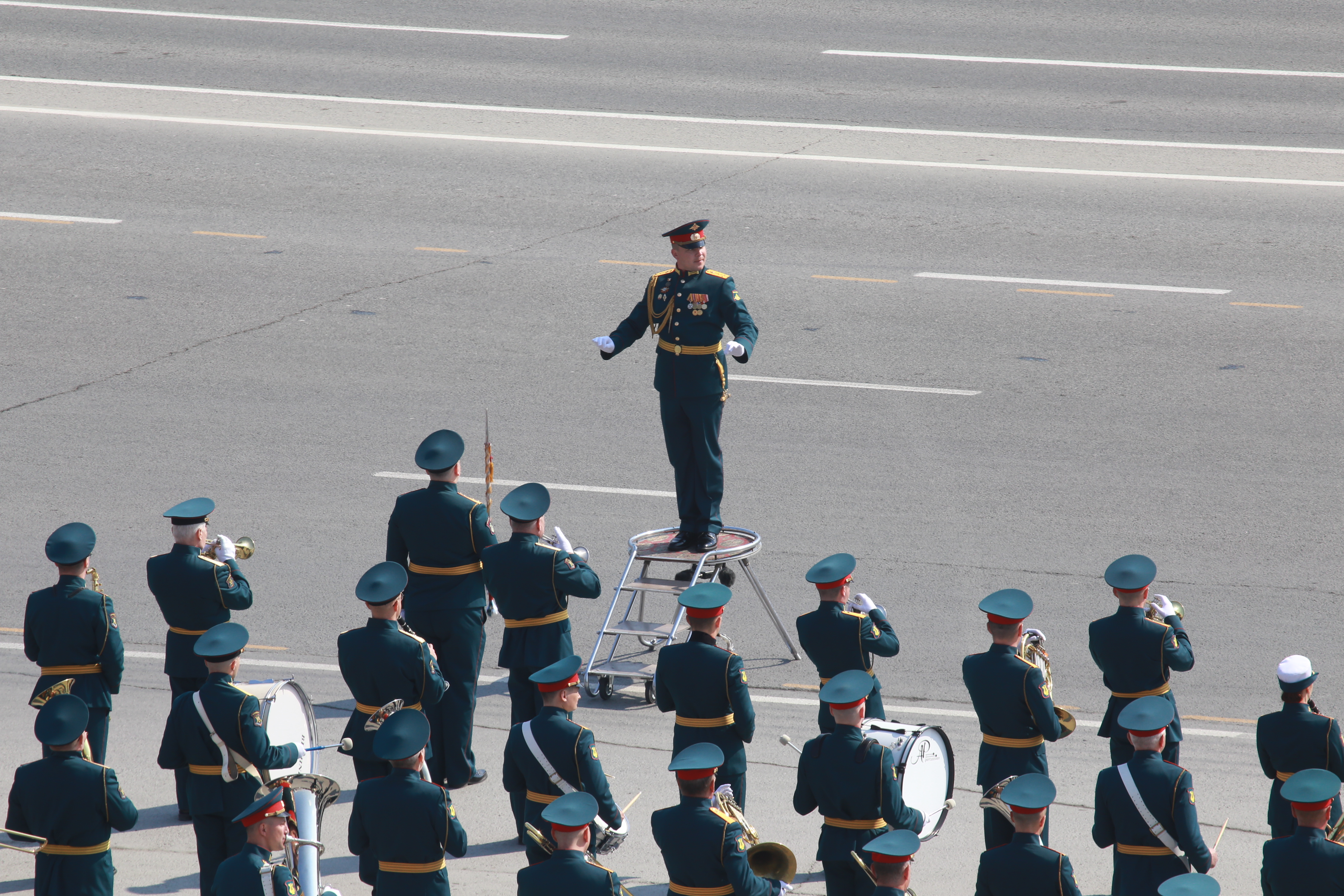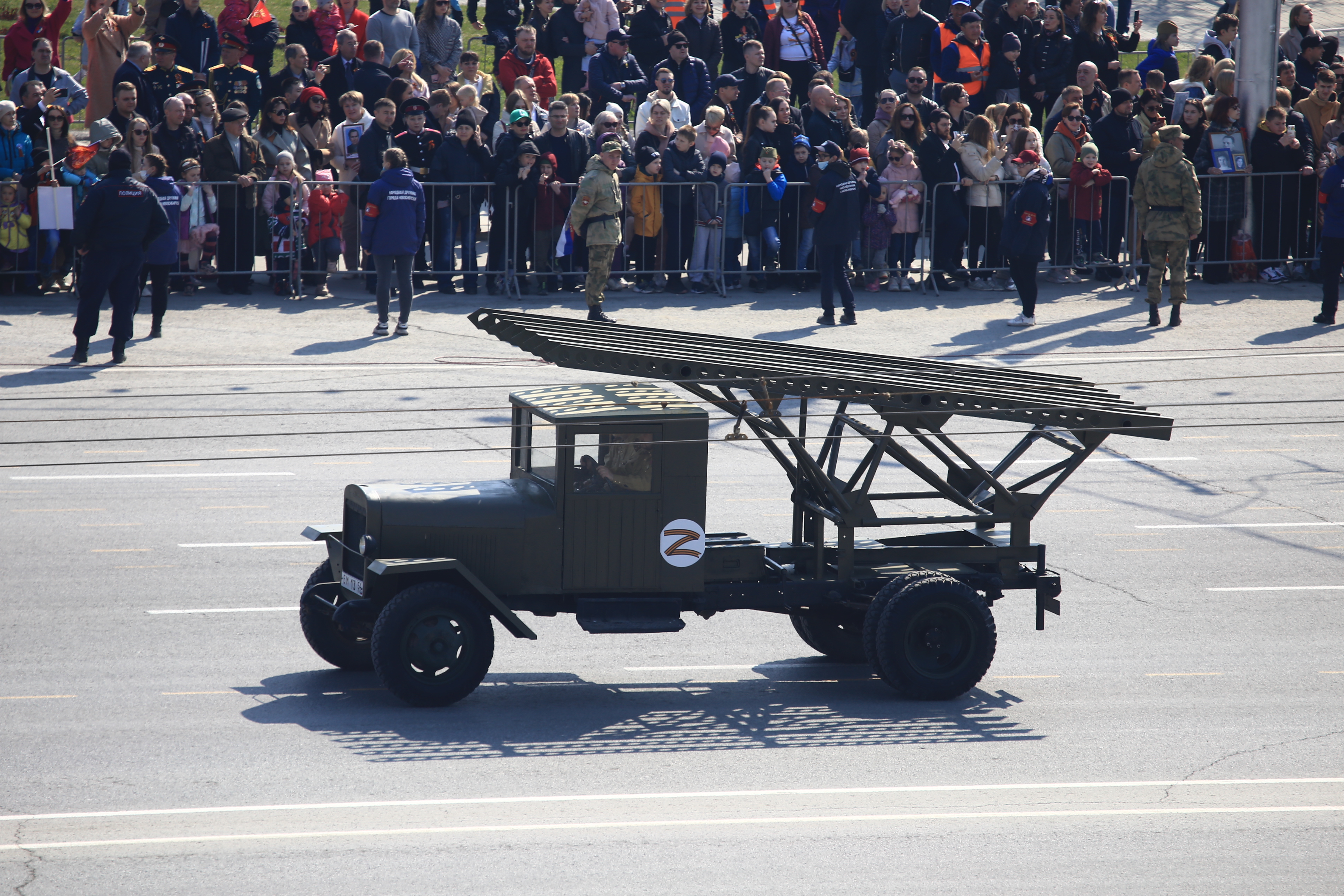 Следом по площади поехала военная техника — вначале отреставрированный танк Т-34, затем бронеавтомобили «Тигр», бронетранспортёры, зенитные комплексы С-400, «Ярс», «Град» и, конечно, легендарная «Катюша». В небе пролетел современный истребитель, а также бипланы, с одного из которых над площадью разбросали листовки.