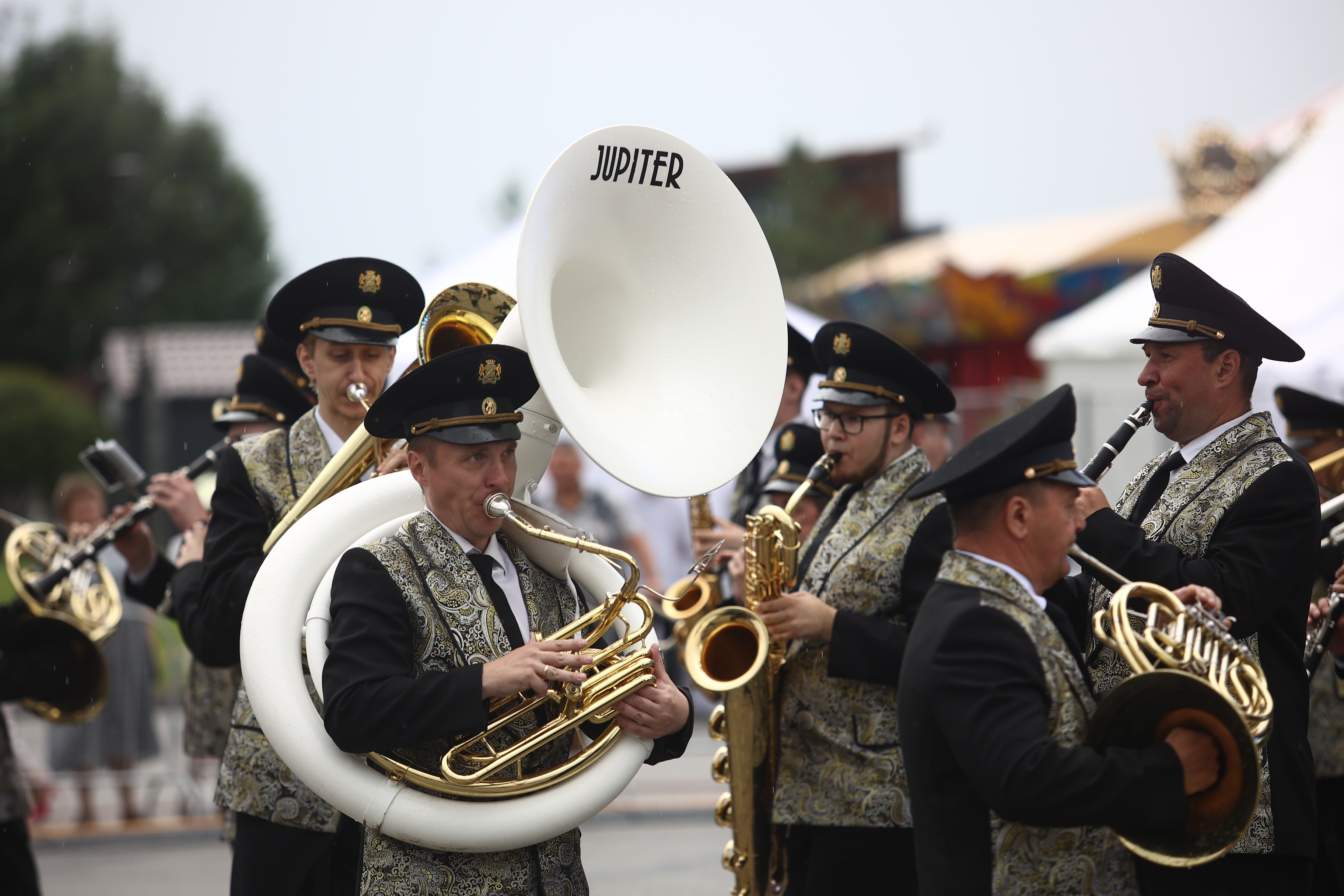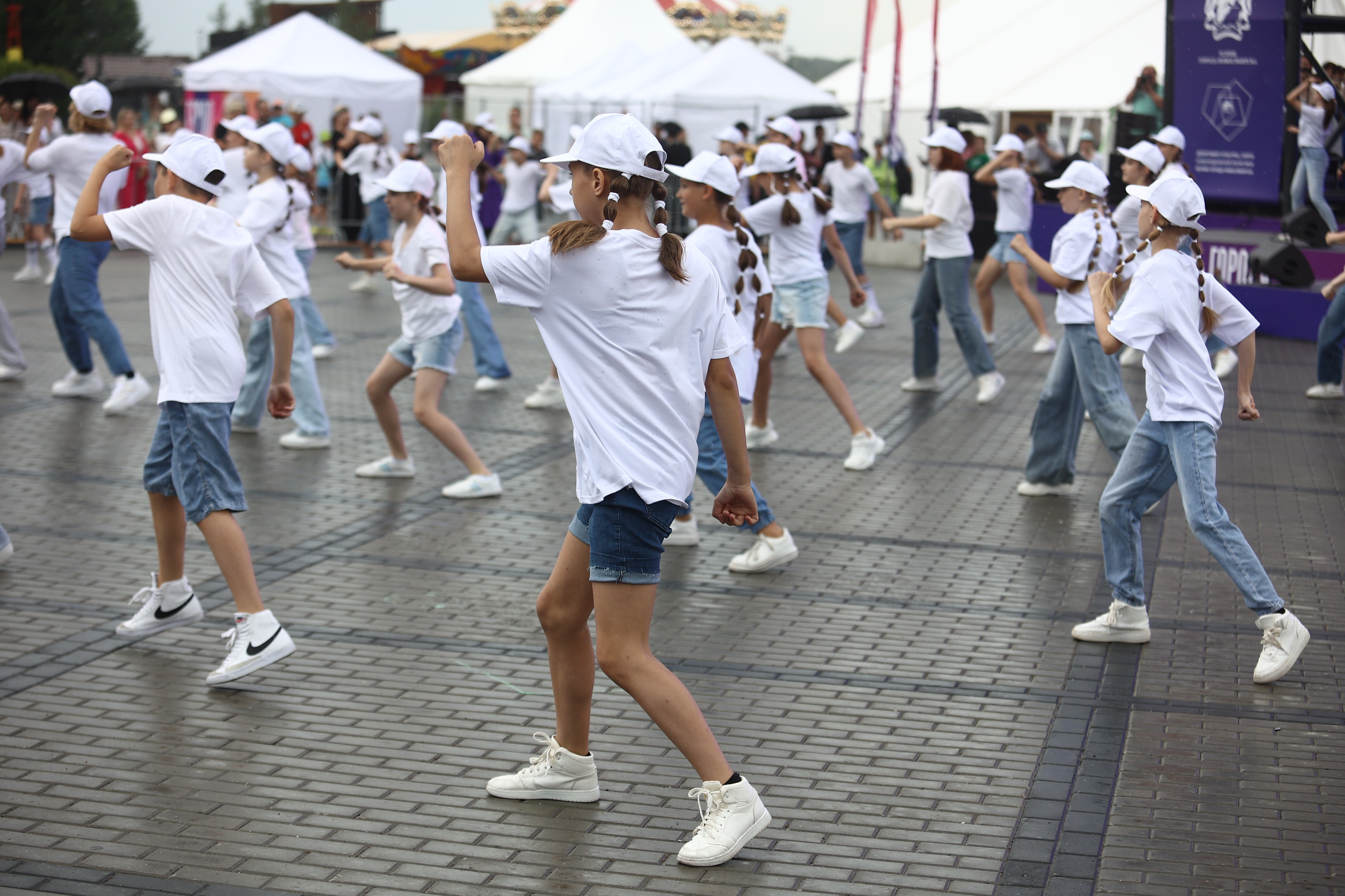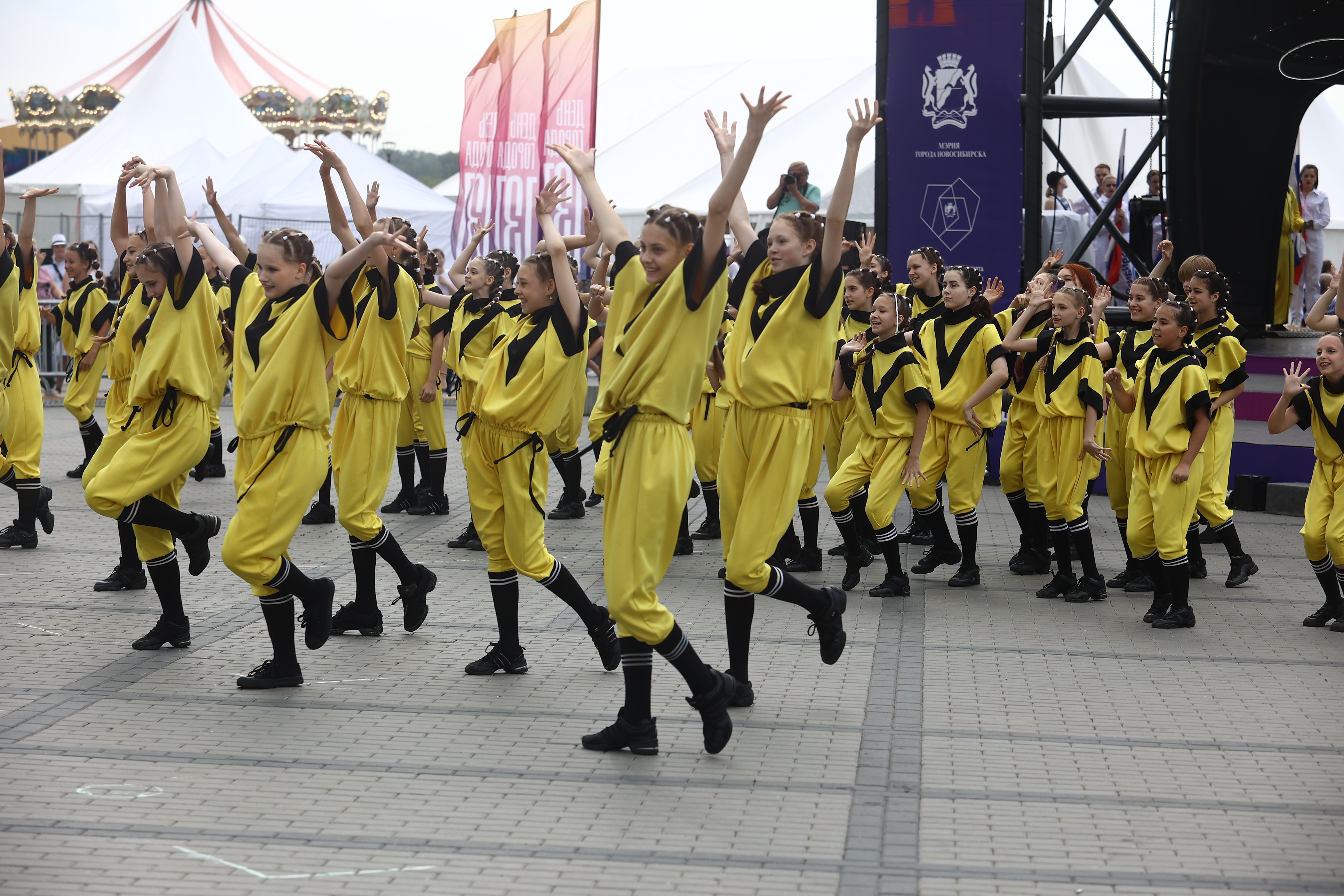 Палящее солнце закрывают тучи. Гости держат зонтики наготове и обращаются в слух: военный оркестр играет марш. Музыканты следуют по намеченной траектории и плавно освобождают место для следующих участников — танцоров. Десятки детей в белых футболках и кепках ритмично двигаются под песни новосибирских коллективов.