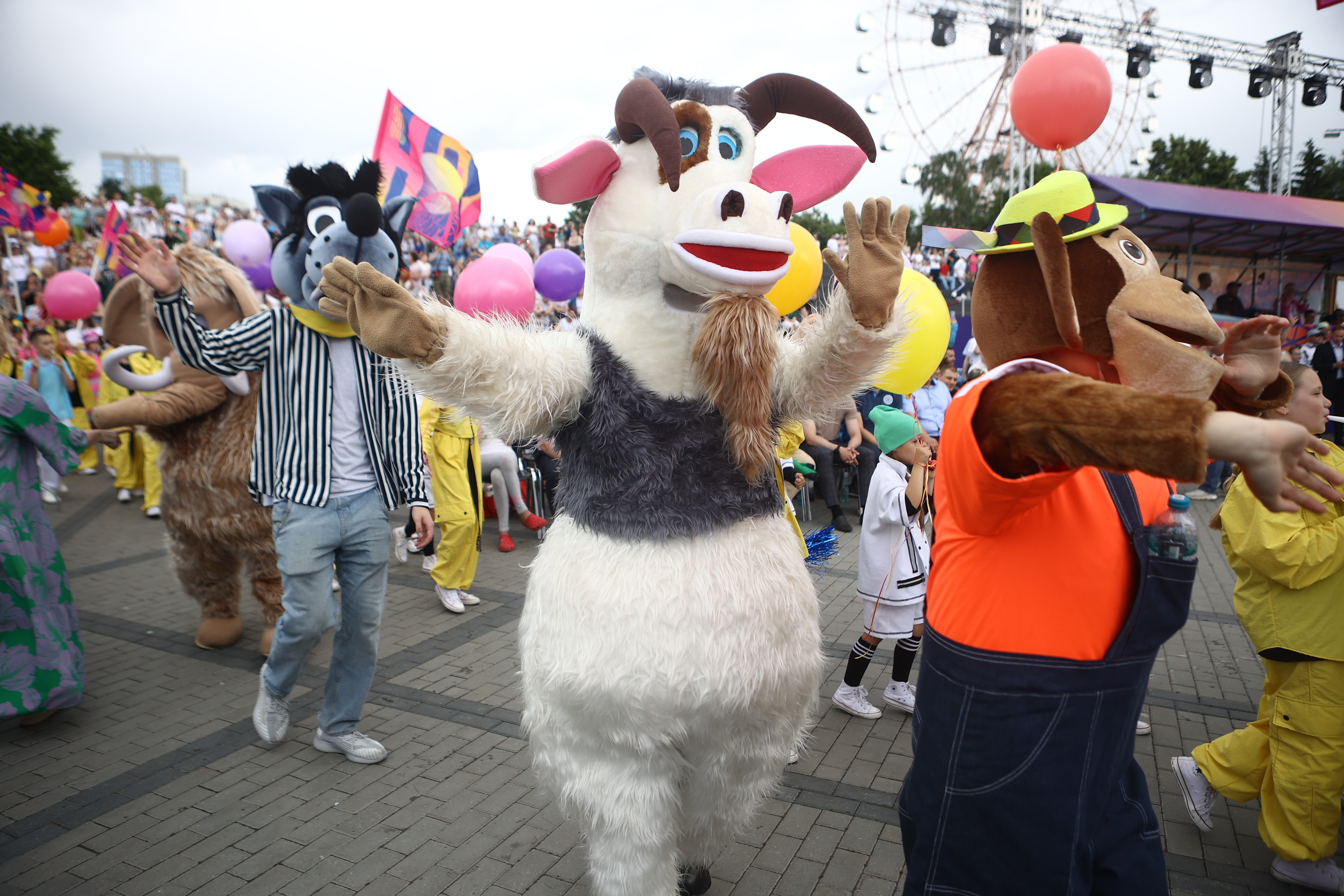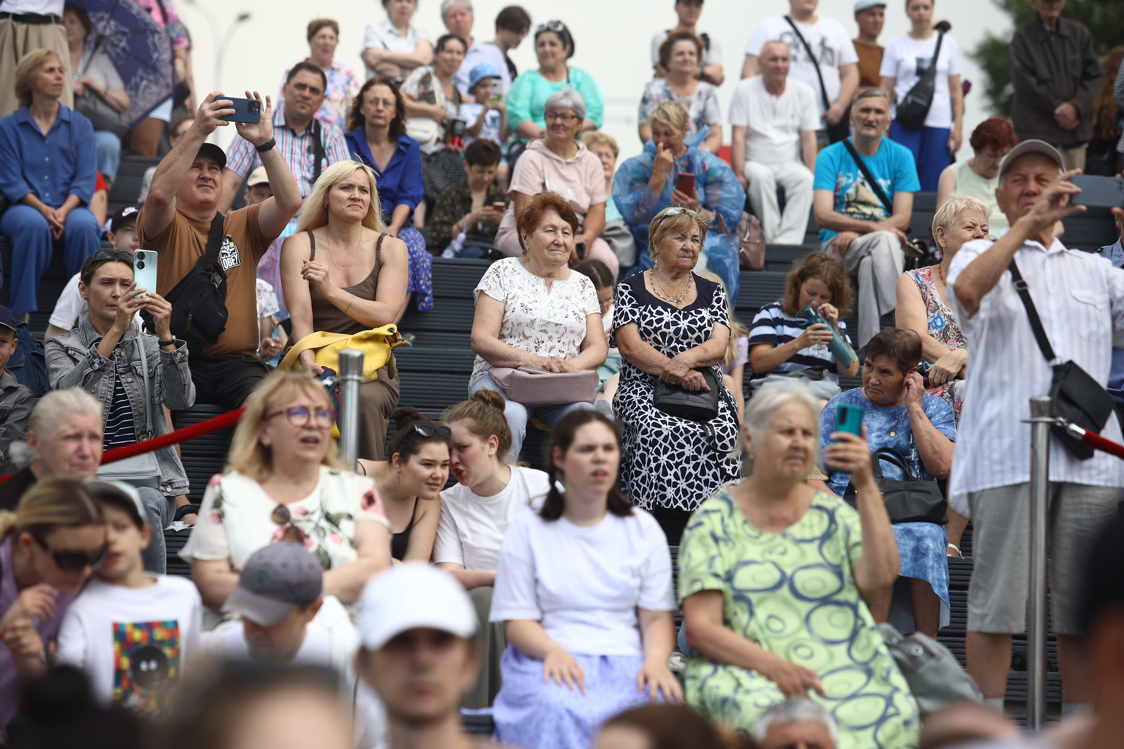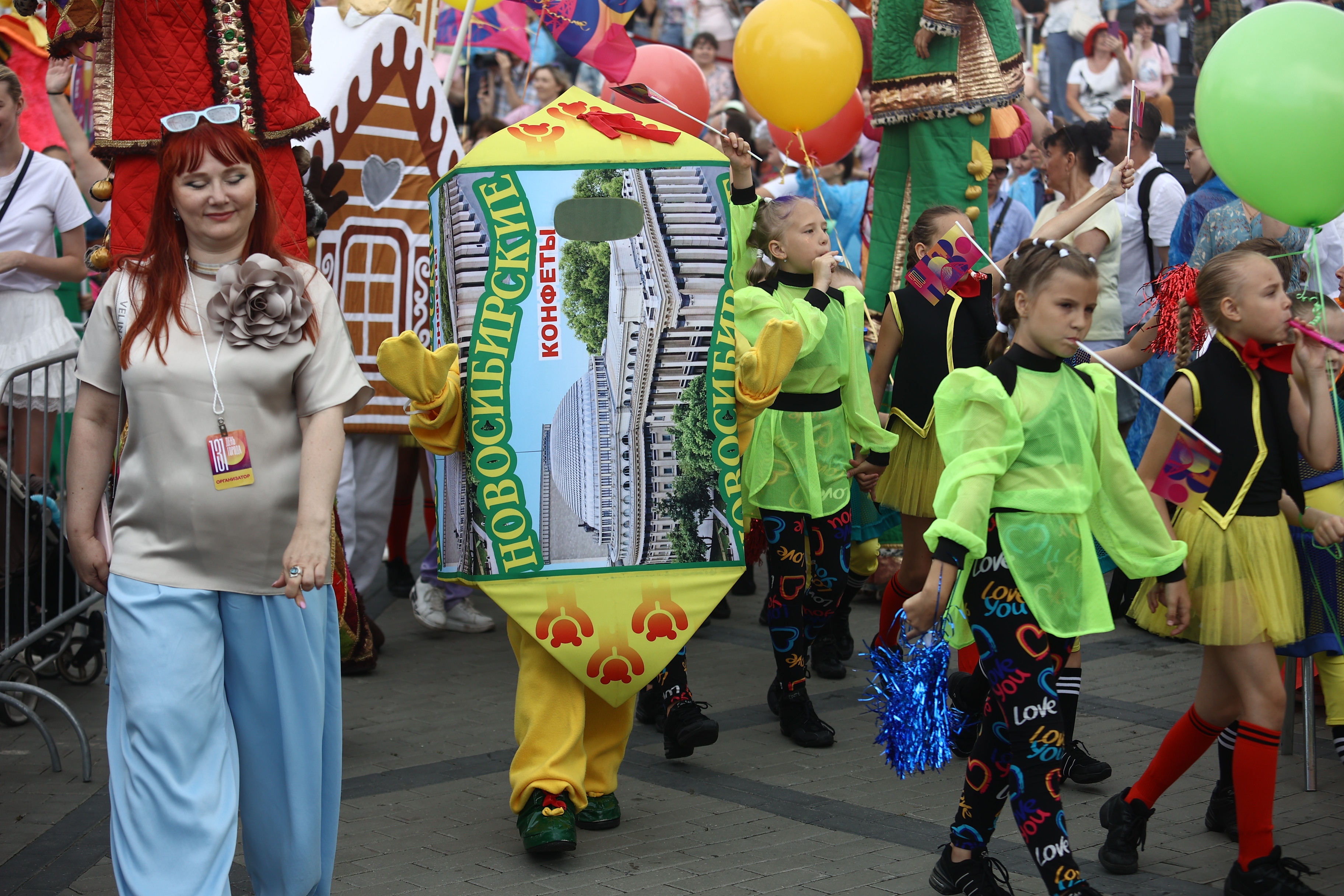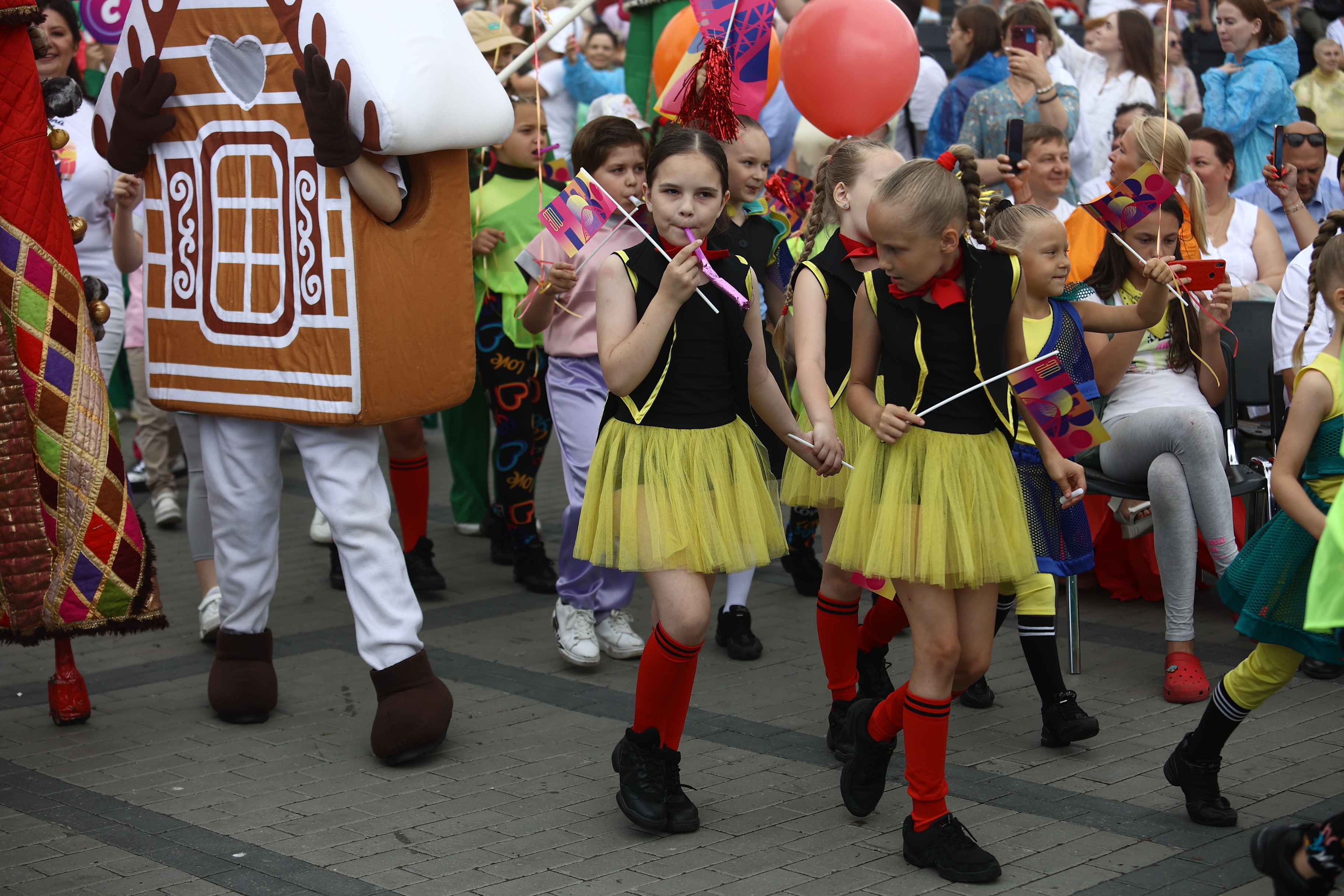 Палящее солнце закрывают тучи. Гости держат зонтики наготове и обращаются в слух: военный оркестр играет марш. Музыканты следуют по намеченной траектории и плавно освобождают место для следующих участников — танцоров. Десятки детей в белых футболках и кепках ритмично двигаются под песни новосибирских коллективов.