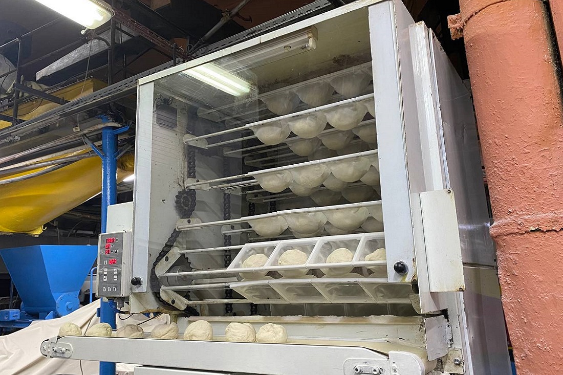 Готовое тесто рубят, потом уже в формах отправляют в расстоечный шкаф. Предмет мебели он напоминает отдалённо — скорее конвейер, где буханки подогревают.