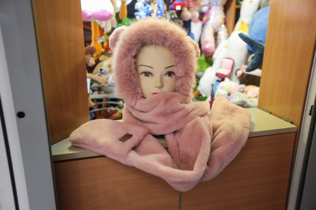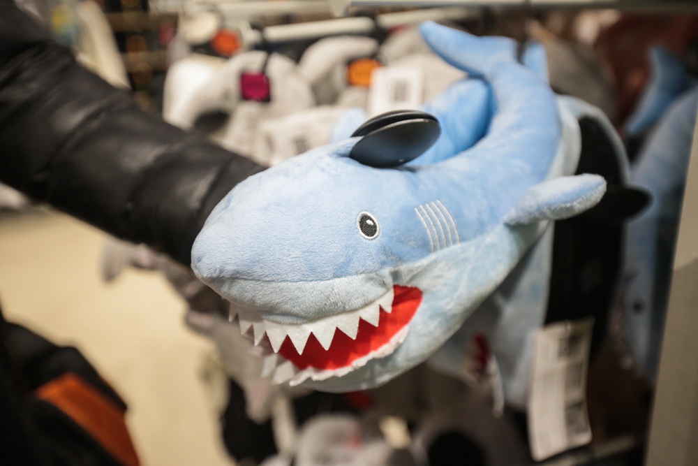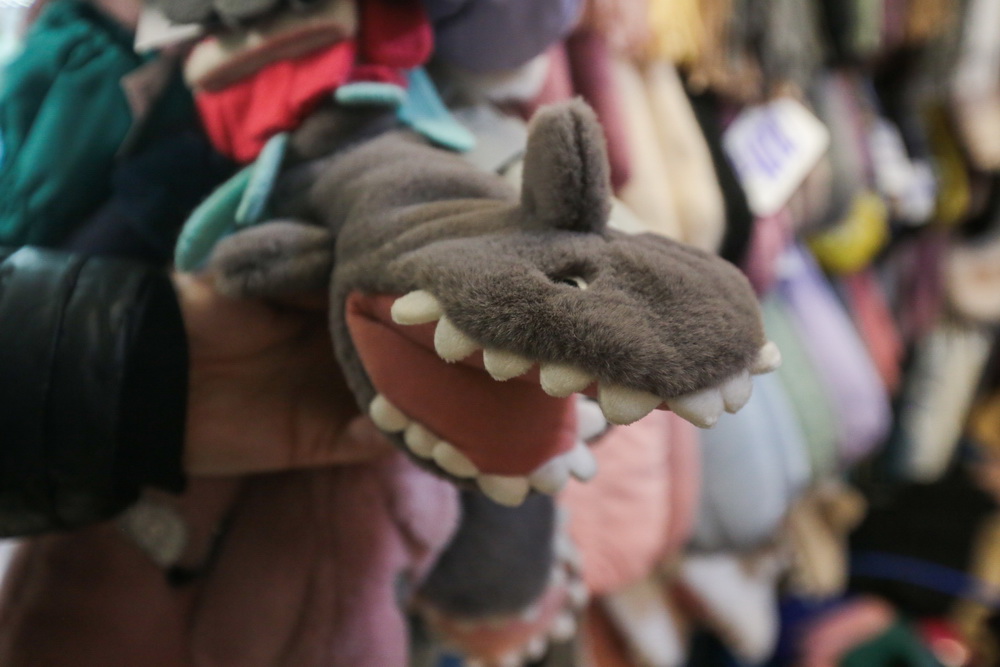 Кроме перчаток с кошачьими лапками, для согревания рук представлен широкий ассортимент варежек. Среди них мы встретили забавные рукавицы-акулы: дикие, но симпатичные.