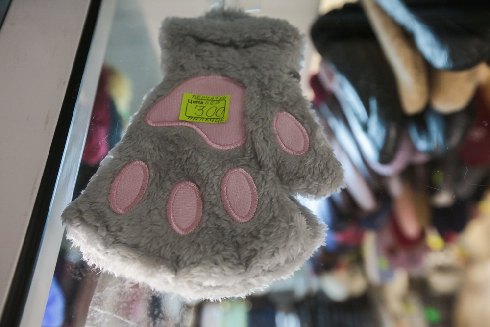 Одним из самых ходовых товаров у продавцов в павильонах подземного перехода на площади Маркса этой осенью стали перчатки-митенки в виде кошачьих лапок. Они выполнены из серого и чёрного трикотажа с розовыми подушечками на ладошках.