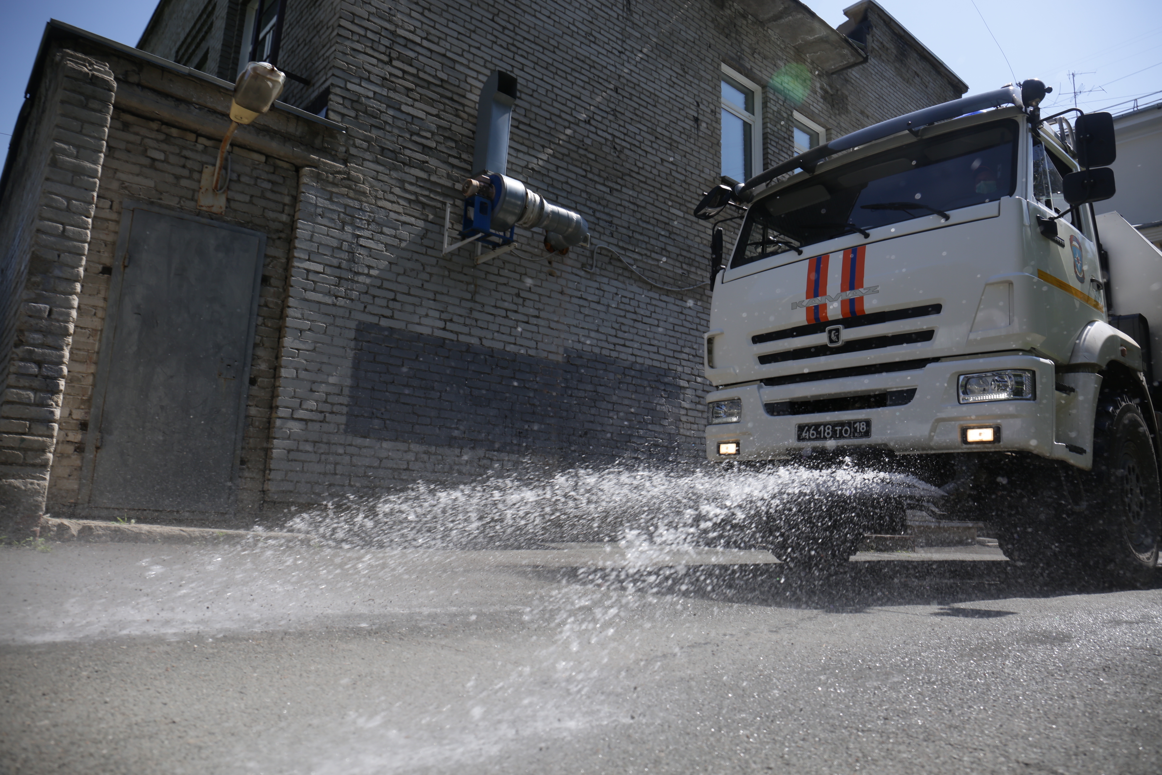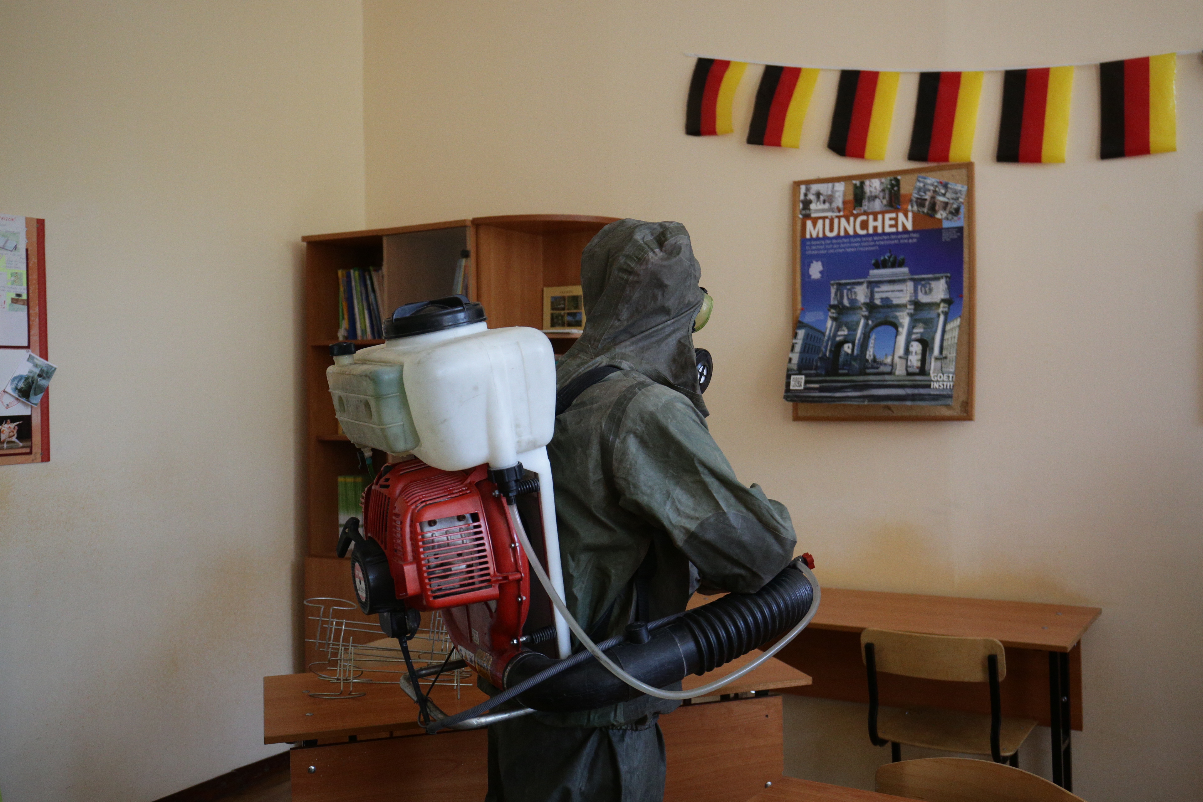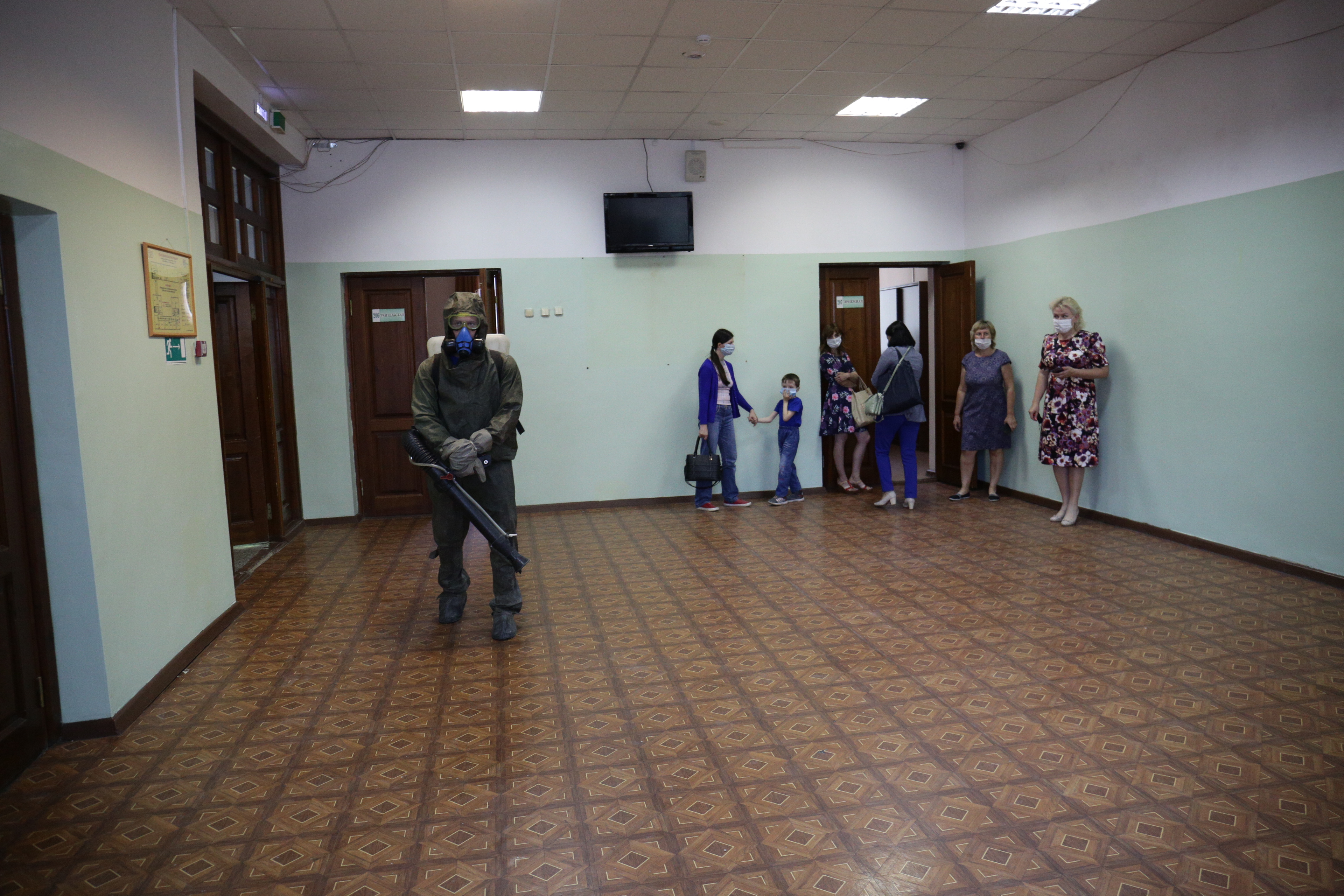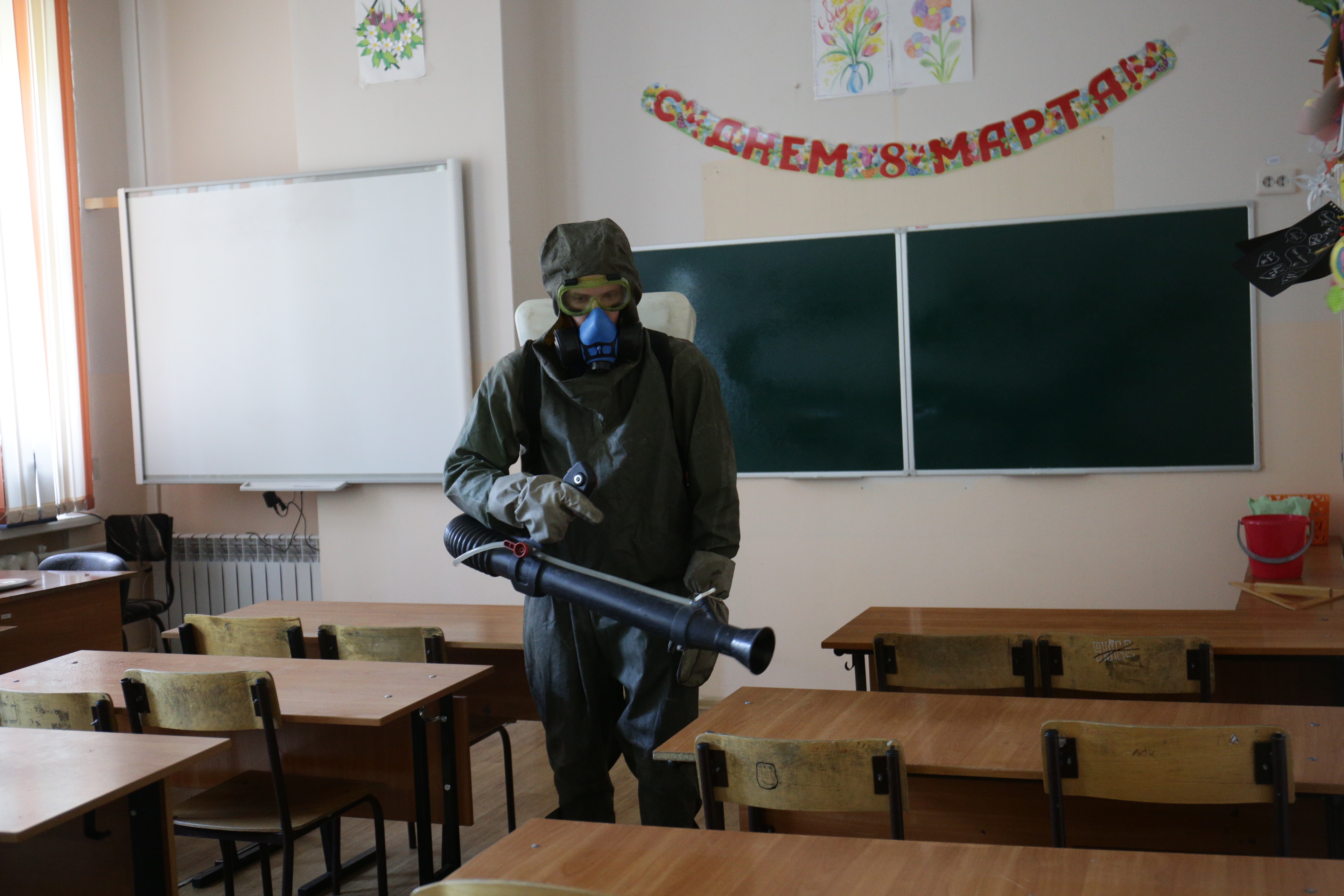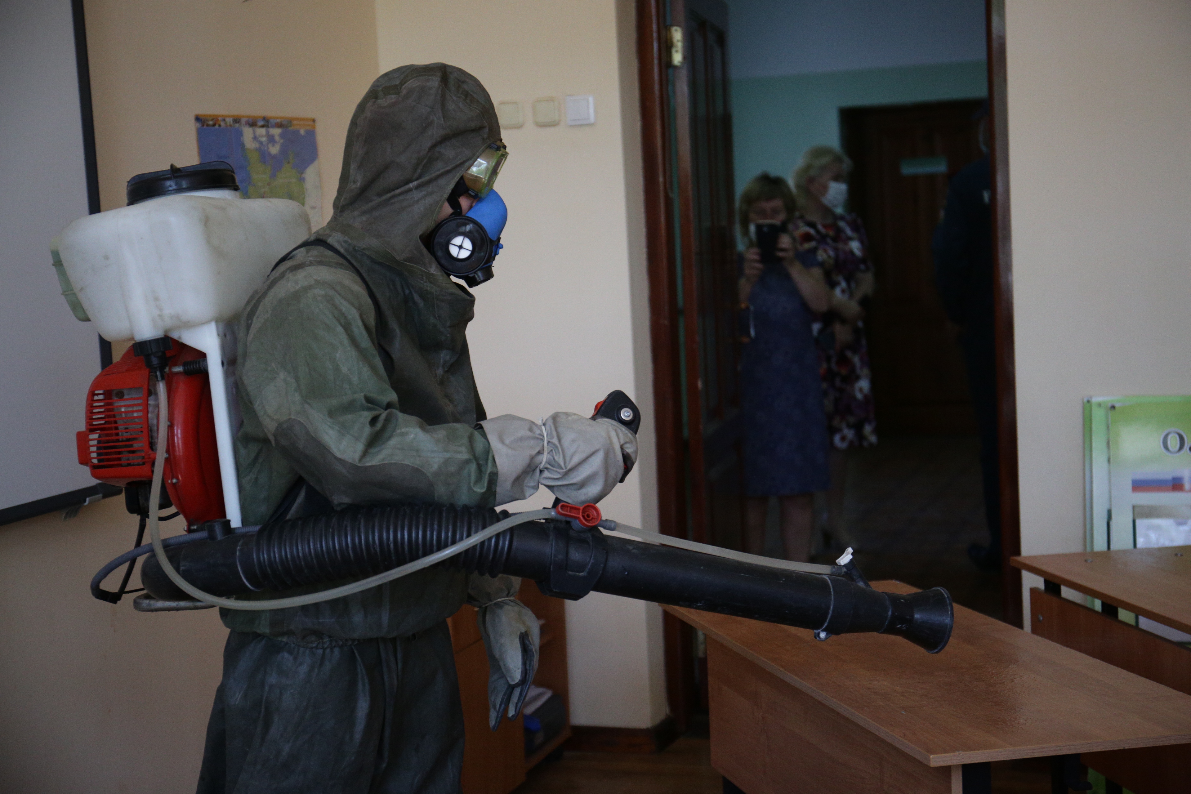 Специальный состав с перекисью водорода распыляют на парты и двери в кабинетах. Раствор убивает вирусы. В обработанных классах выпускники в июле будут сдавать ЕГЭ.