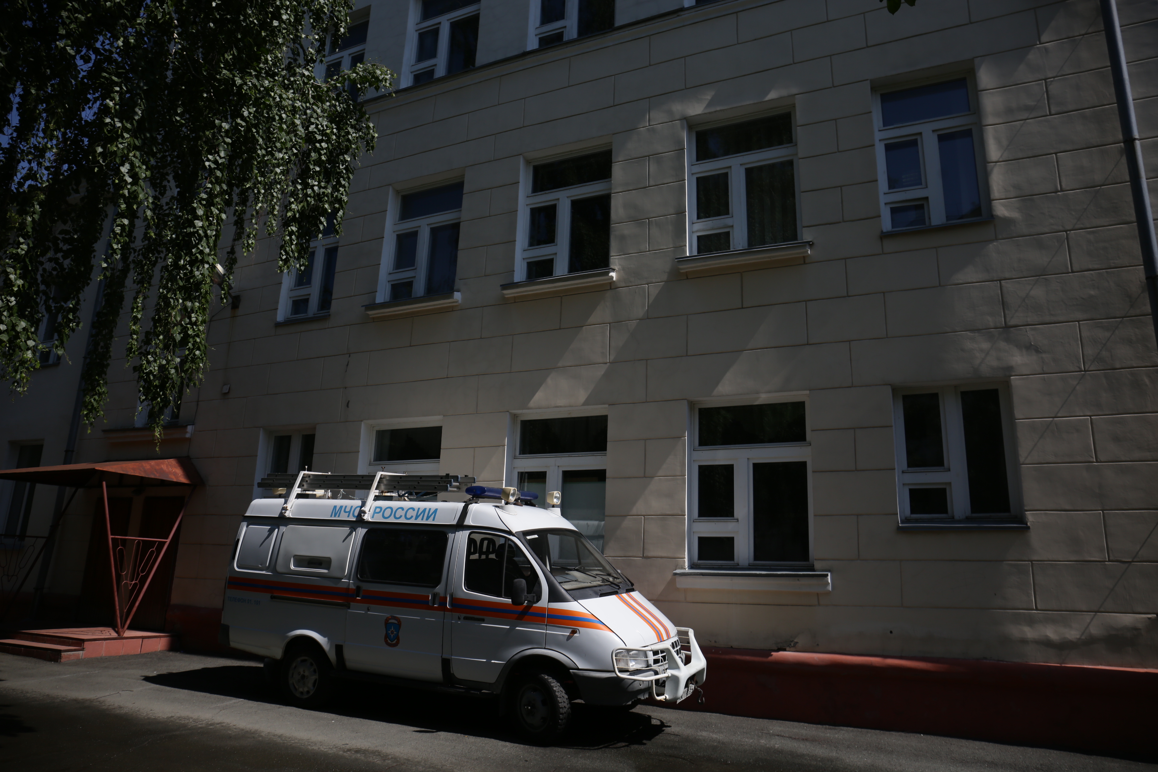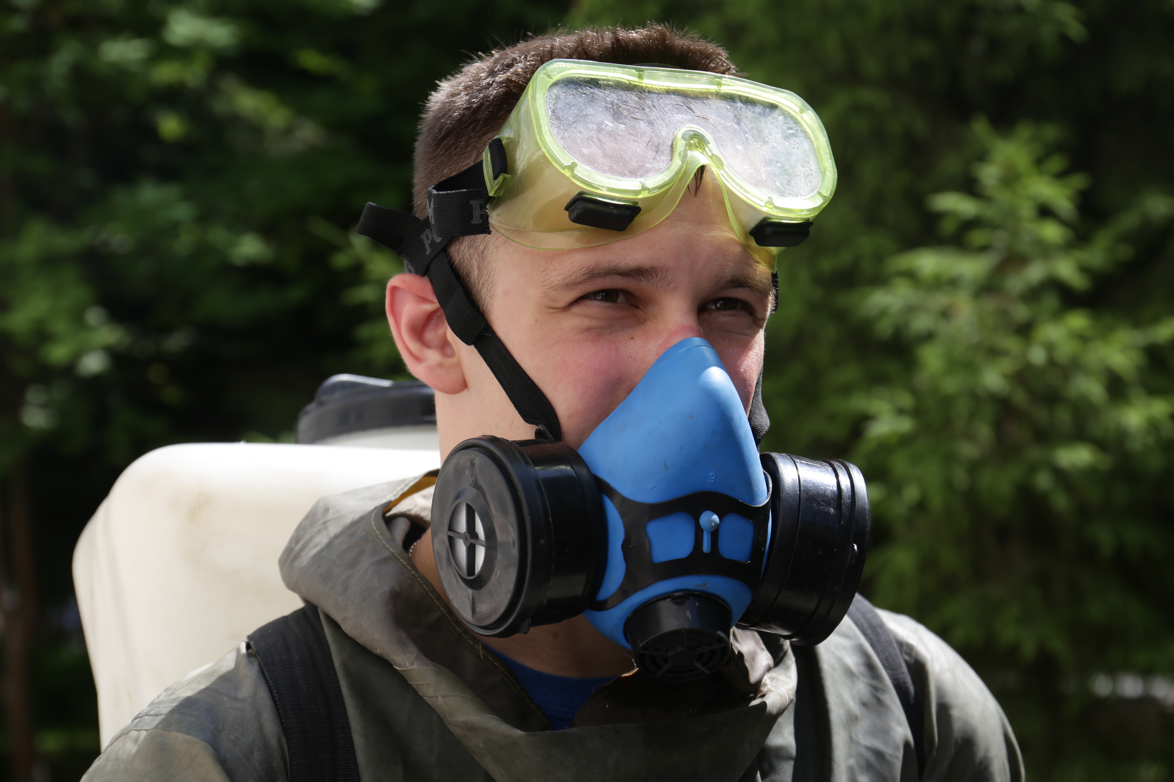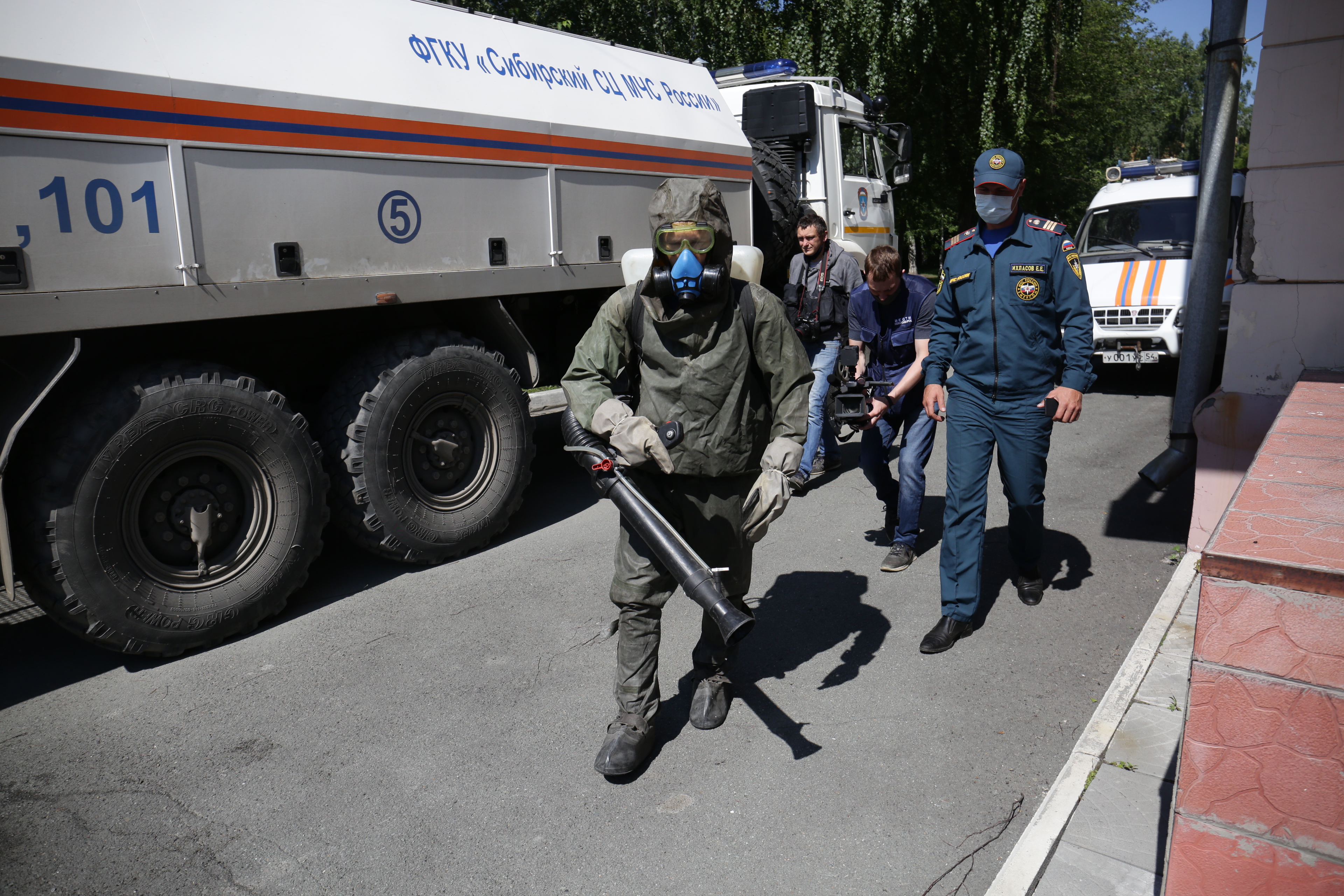 Перед входом в школу сотрудники МЧС надевают защитный костюм, очки и респиратор. Замешивают спецраствор и начинают работу. Обрабатывают учреждение снаружи и внутри.