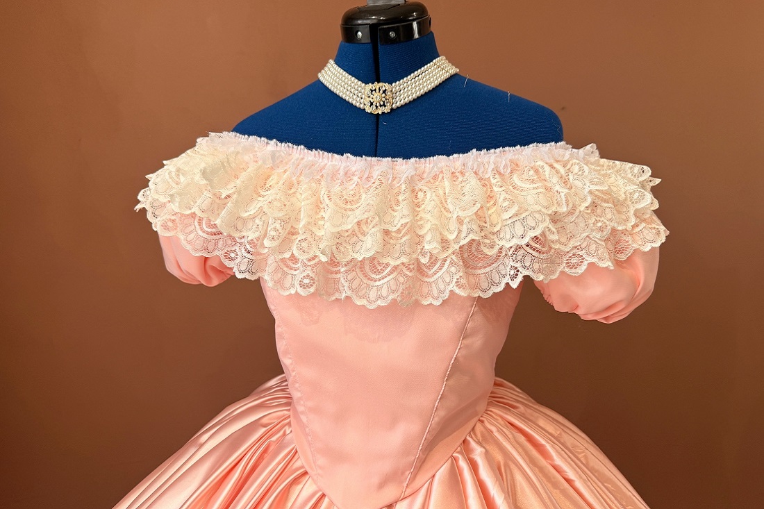 Три слоя подъюбников, кружева в несколько ярусов, корсет и кринолин — автор стремится максимально воссоздать аутентичный силуэт середины позапрошлого столетия.
