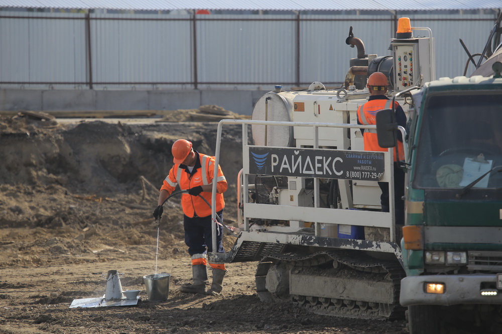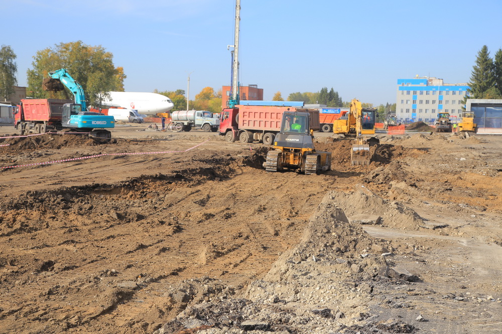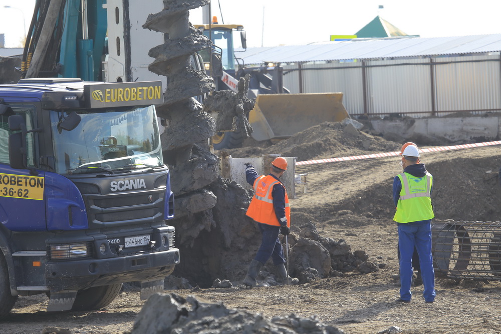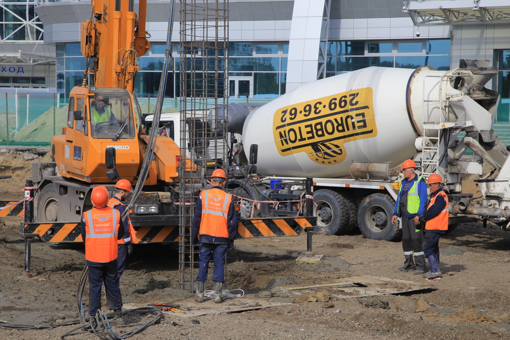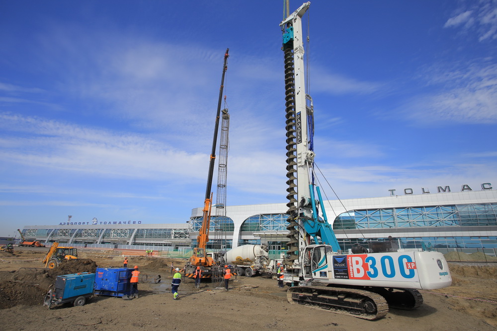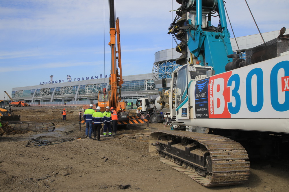Первую сваю фундамента нового терминала аэропорта Толмачёво погрузили в землю -на глубину 27 метров. Работает гигантский бур, миксеры перемешивают бетон — почти бесшумно.