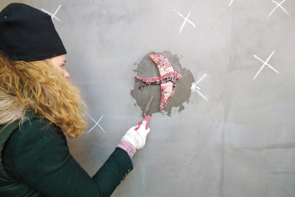 Пиксельных птичек из цветного стекла начали клеить на стены «Победы»