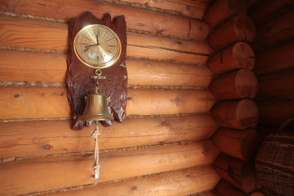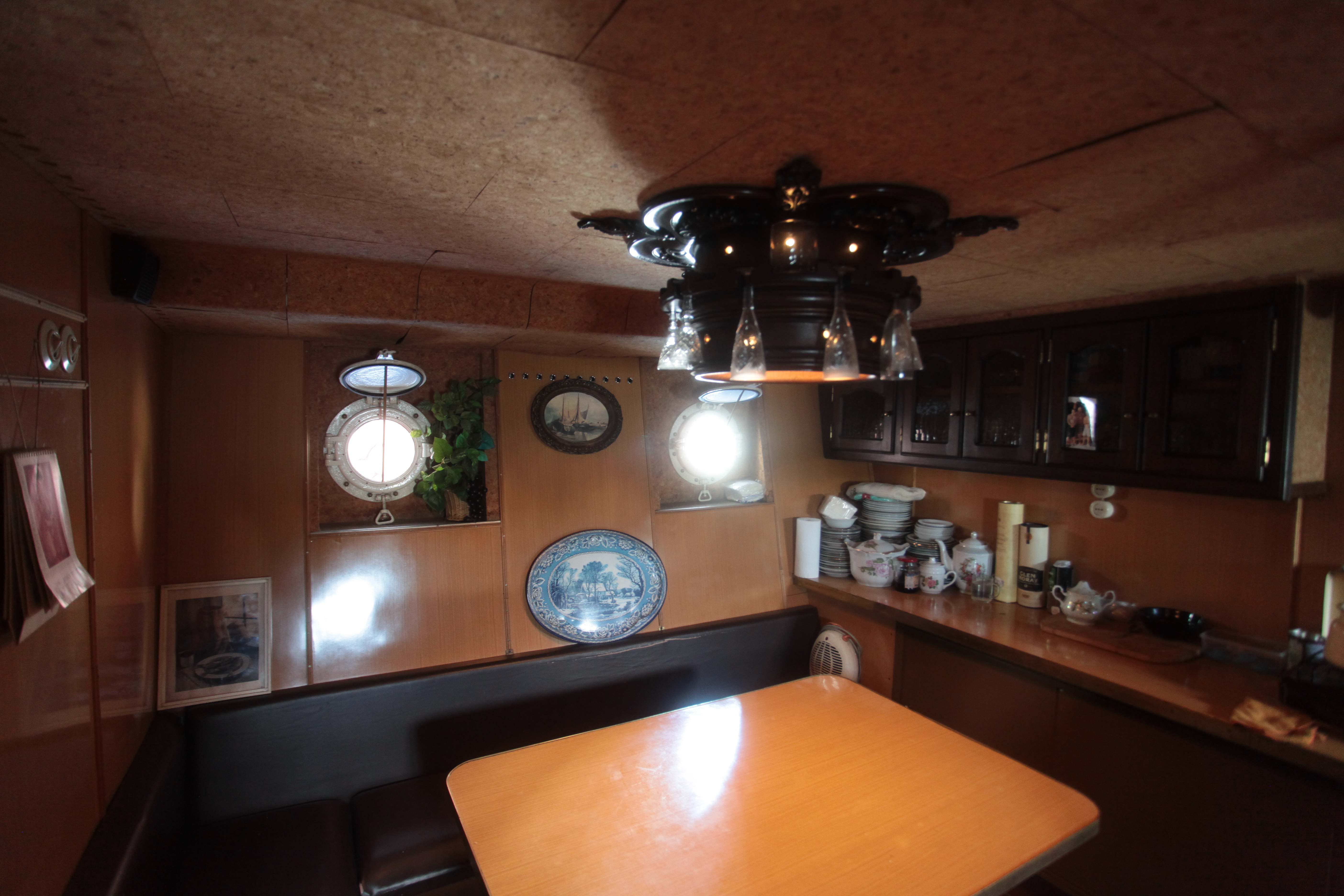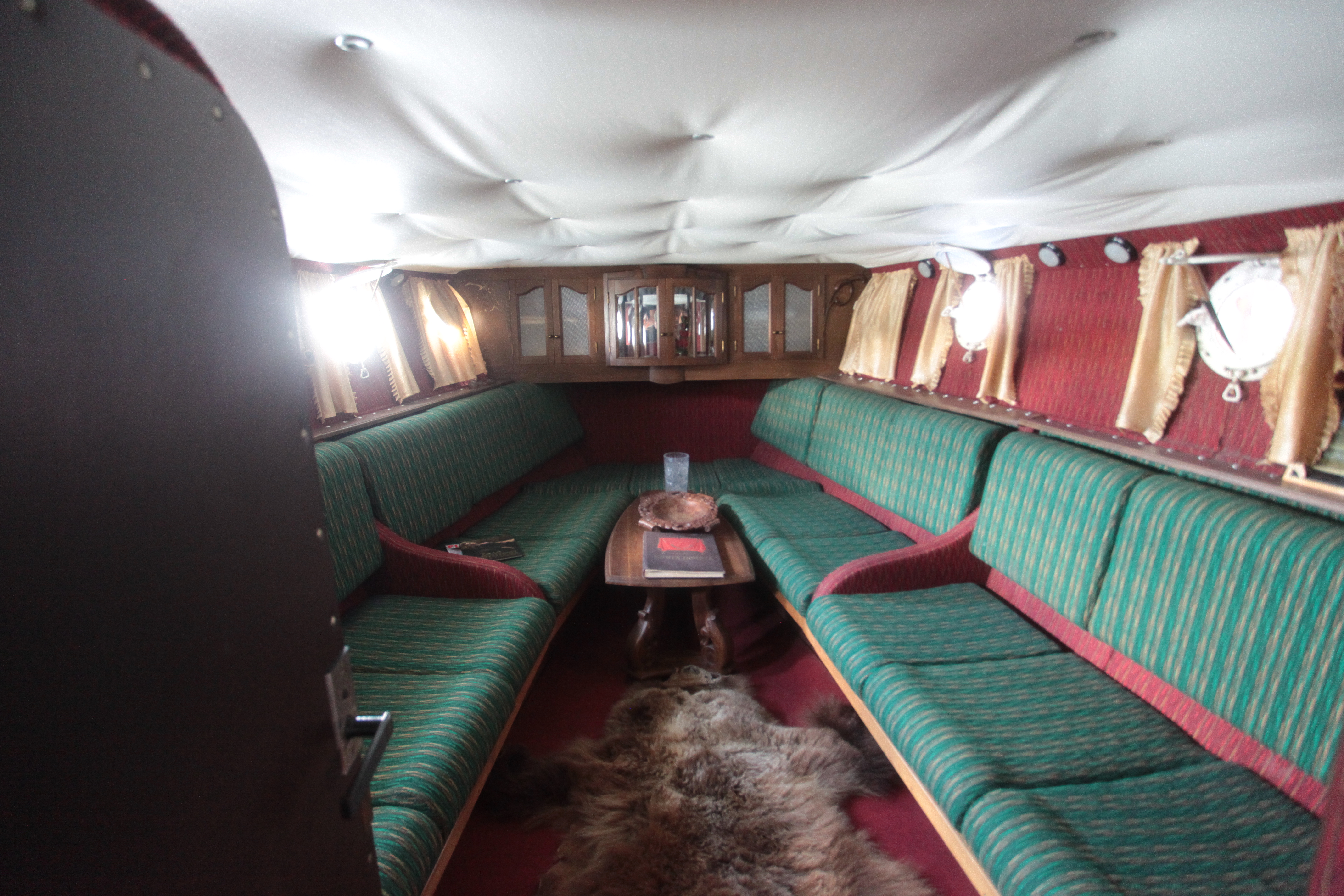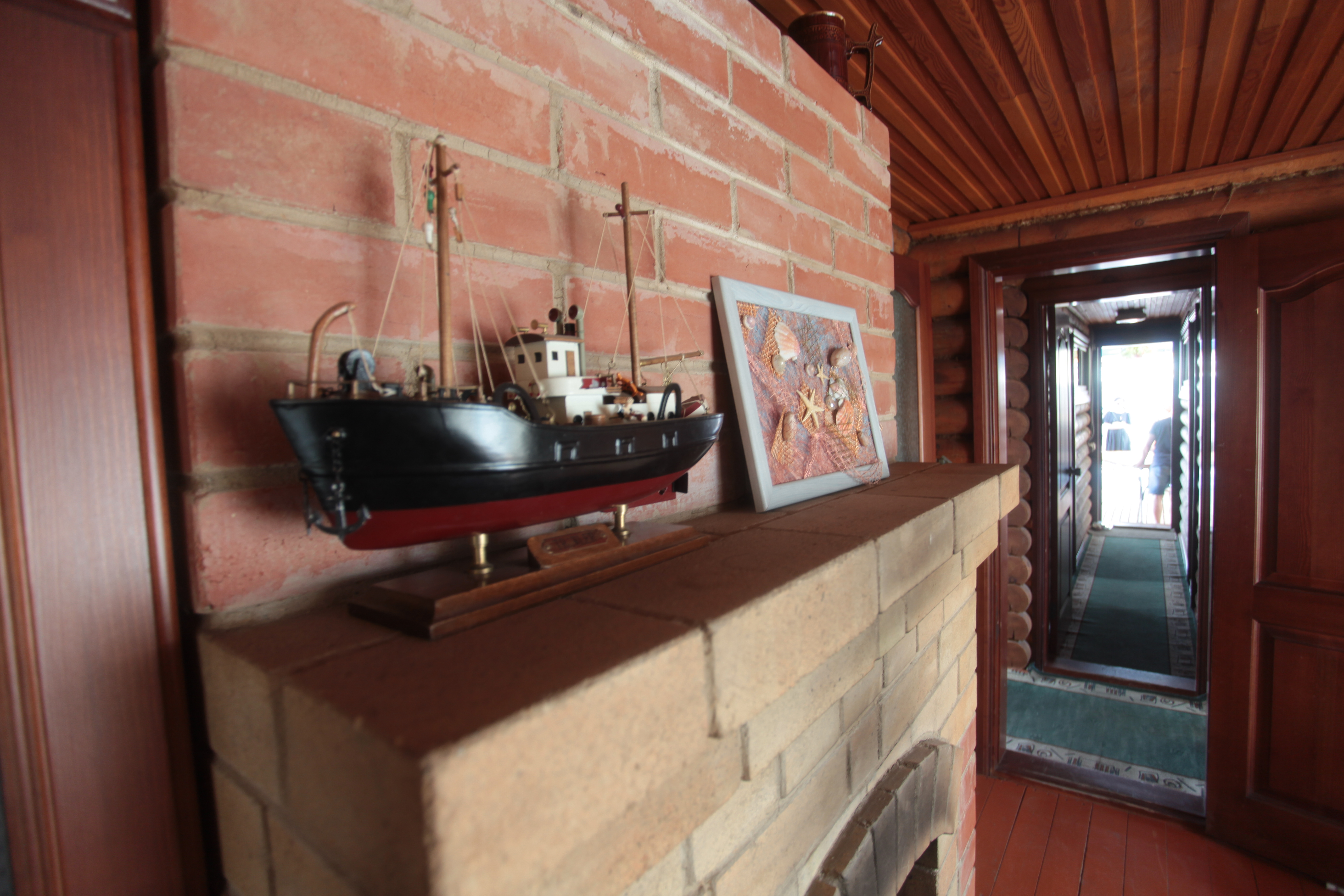В домике умещаются две небольшие комнаты с санузлом и душем, гостиная с камином и выходом на заднюю палубу, миниатюрный камбуз (кухня), передняя каюта с мягкими диванами, баня на дровах. Кстати, она функционирует прямо на ходу. Из парилки можно сразу нырять в речку. Для этого на задней палубе предусмотрен специальный сход, куда крепится лестница.