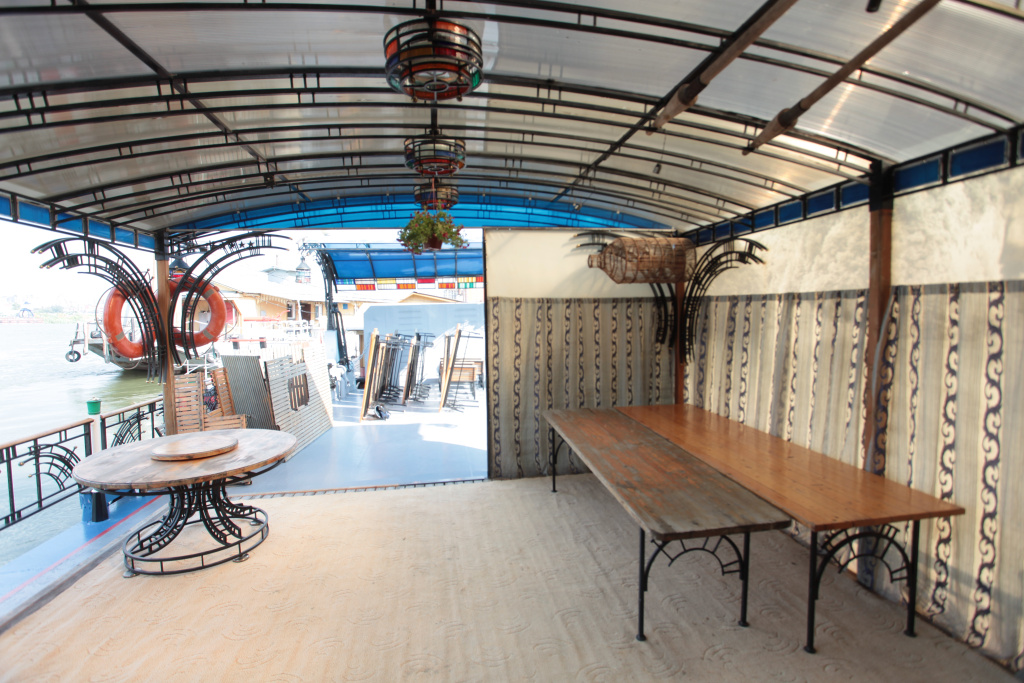 На веранде поместится автомобиль, а то и два. Они могут заехать на баржу с берега по специальной аппарели с электроприводом. Осадка судна — примерно 300-400 мм. Это позволяет причаливать в любом месте для схода транспорта.