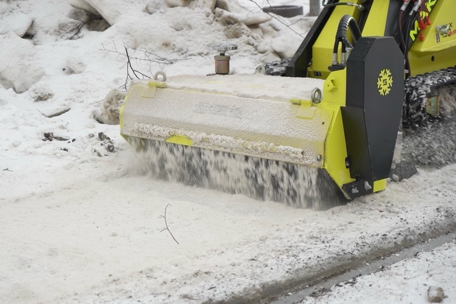 «Толщина наледи снимается до определённого уровня. За несколько проходов очищает до допустимой нормы, которую посыпают песком. За счёт универсальности можно поставить щётку и за один проход убрать крошку. В таком случае ручной труд не понадобится», — описал преимущества мини-техники директор компании-производителя Вячеслав Макаров.