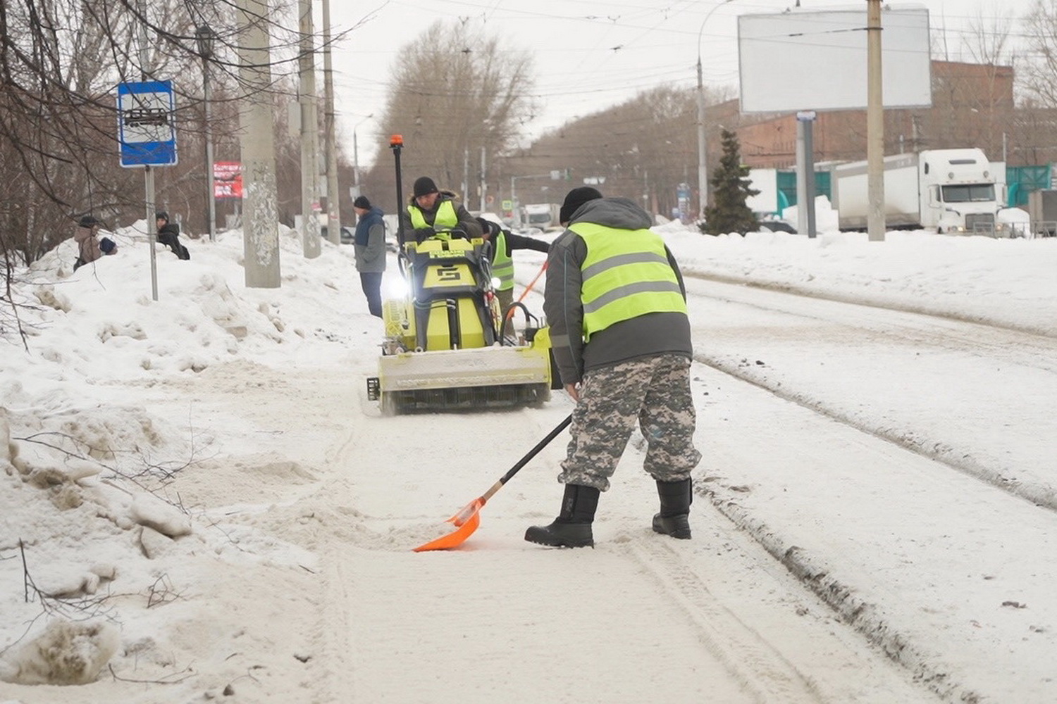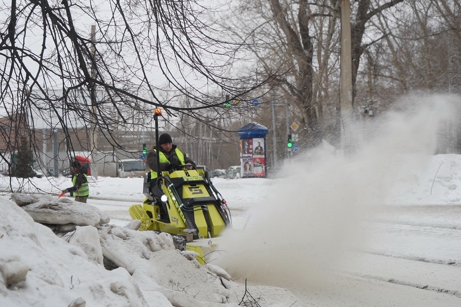 Новую технику для зимней уборки тестируют в Кировском районе. Небольшой трактор-ледоруб используют, чтобы расчистить пространство возле остановок и трамвайные пути.