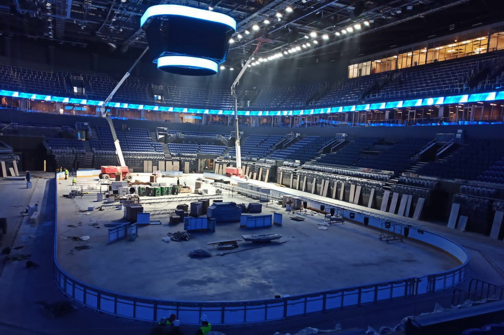 Под потолок новой ледовой арены подняли светящийся медиакуб
