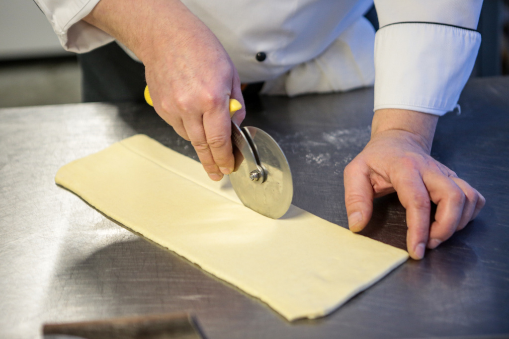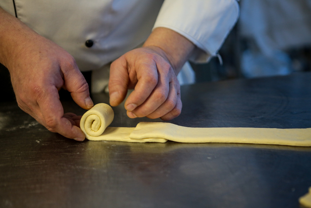 Слоёное тесто раскатывают толщиной 5-6 мм. Если сделать тоньше, то можно сломать слои, и нужной структуры мы не получим. На одно изделие берут полоску теста весом 140 грамм. Шеф поясняет, что серединку не закатывает плотно, чтобы в духовке она не поднималась.