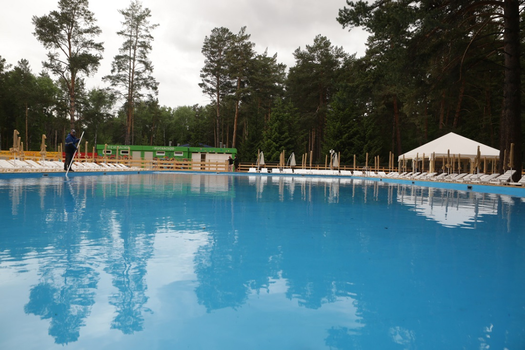 Пляж с видом на лес и озеро. Четыре бассейна: «Семейный» — для гостей с детьми, «Луна» — для взрослых, две отдельных чаши для малышей и ребят постарше. А ещё: шезлонги, душ, кабинки для переодевания, комната матери и ребёнка, кафе, игровая зона и дополнительные услуги от партнёров.