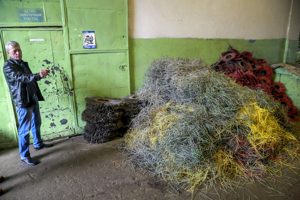 Современные щётки позволяют счищать снег до самого асфальта. Кстати, их в ДЭУ-1 делают сами. Сначала разбирают тарелку со сточенным ворсом, выбивают его из чаши. Новый ворс замачивают в ванне с кипятком, чтобы стал гибким, а потом прикручивают — тоже вручную. Замена щетины называется «перебивка». Щётка стирается примерно за неделю работ ровно вполовину — это знак, что пора её поменять.