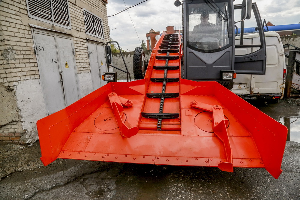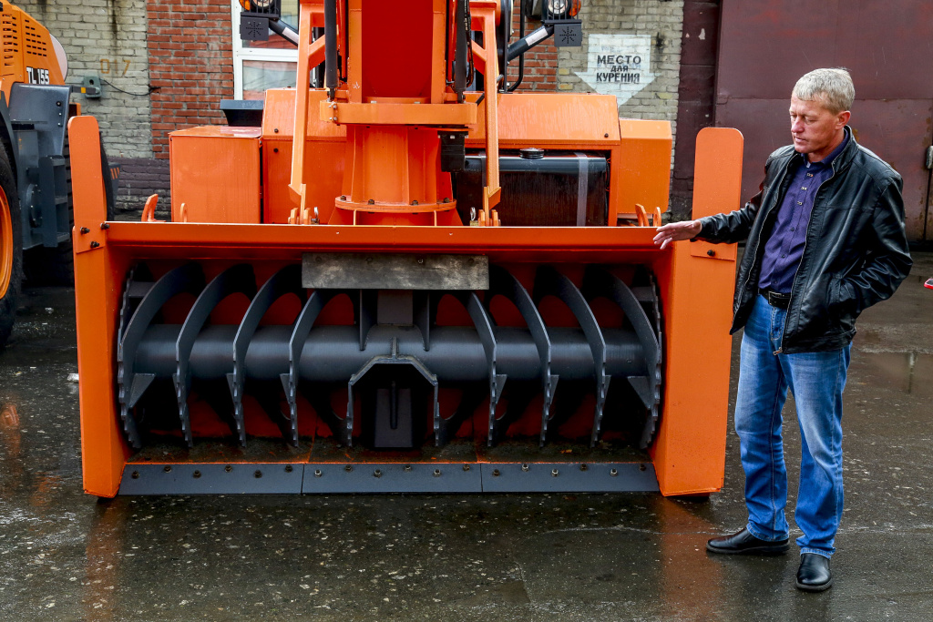 Это универсальный вид техники для погрузки снега. Конструкции заменяемые. Можно, например, поставить шнекоротор. Это превосходный помощник зимой. На вид напоминает мясорубку — через жёлоб собирает снег и выкидывает в специальную трубу. Он летит под напором и сыплется в движущийся рядом самосвал. Чем быстрее вращается вал, тем сильнее получается фонтан из снега.