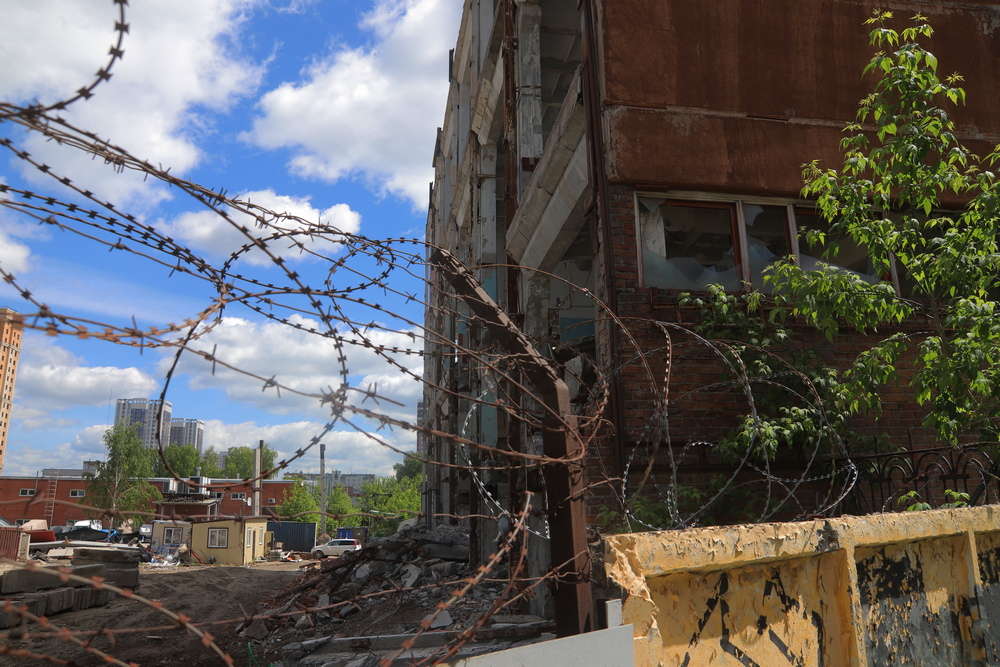 Демонтаж идёт неспешно, техника аккуратно разбирает пятиэтажный корпус, принадлежавший новосибирскому жиркомбинату.
