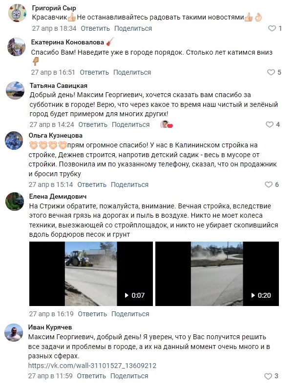«Максим Георгиевич, успеха вам на данном поприще! Мои пожелания: посадить в городе очень много деревьев, построить велотрассу для тренировок на шоссейном велосипеде продолжительностью хотя бы 7–15 км», — высказывается там же Галина Апушкина.